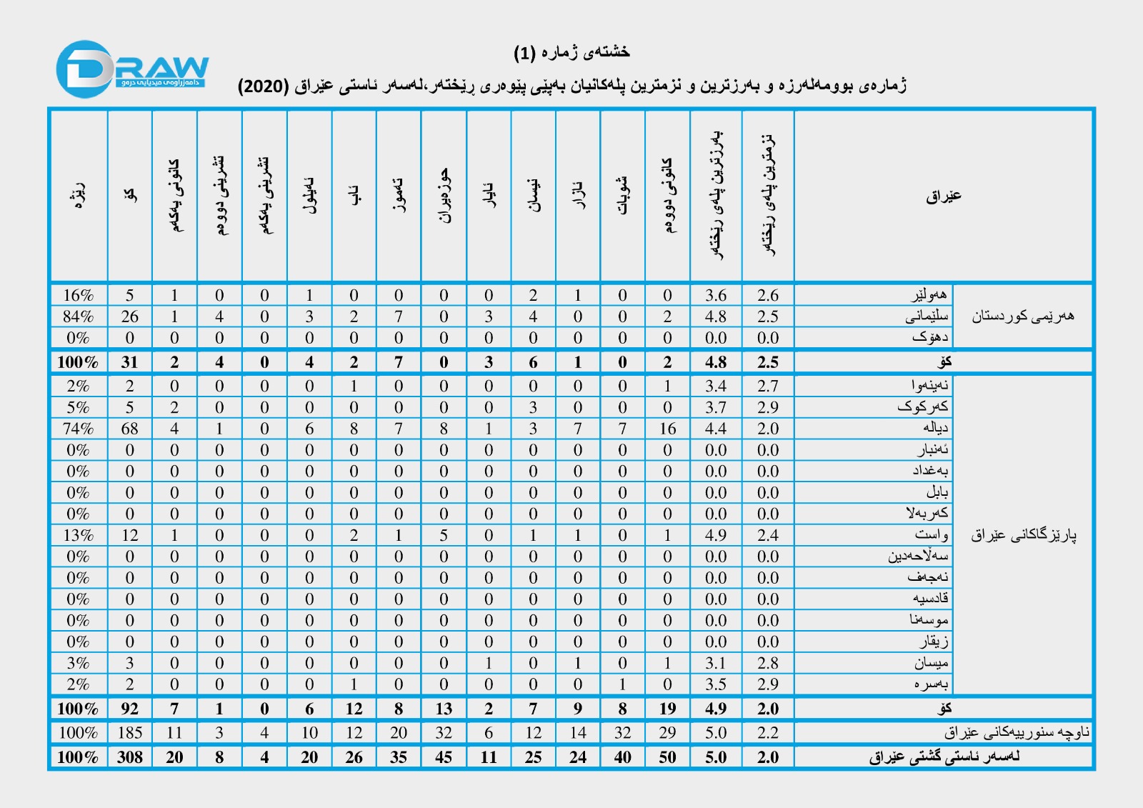 یەکەم؛ ژمارەی بوومەلەرزە و بەرزترین و نزمترین پلەکانیان بەپێی پێوەری ڕێختەر، لەسەر ئاستی عێراق و هەرێم لەساڵی (2020)