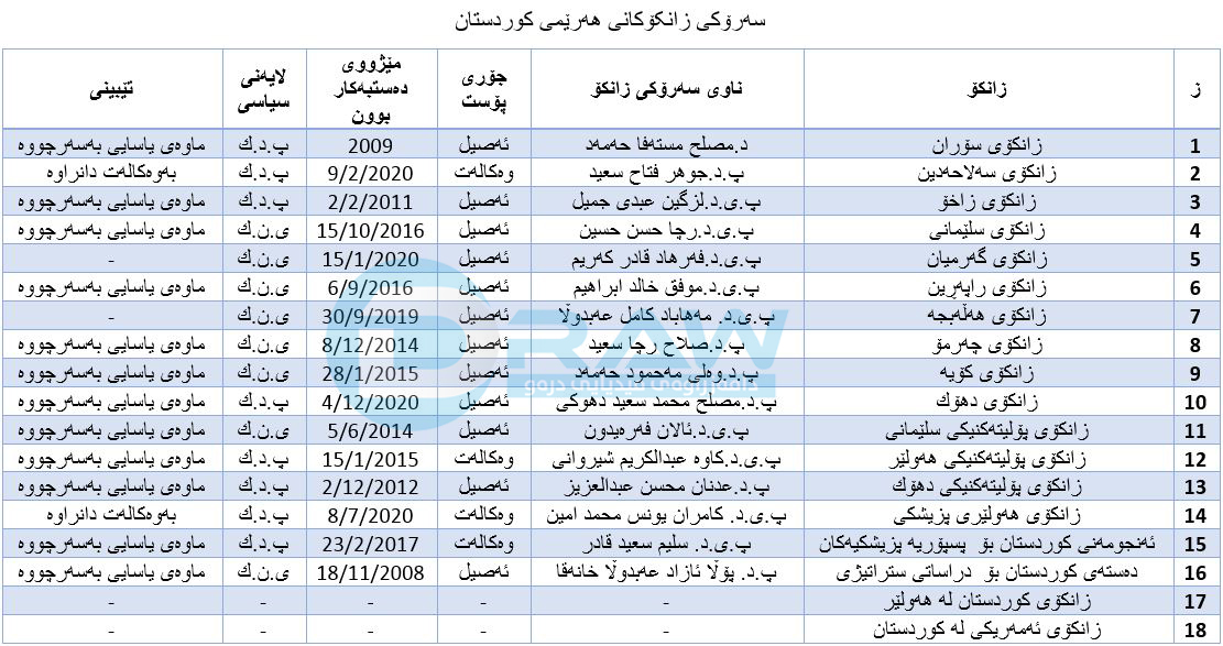 %67ی سەرۆكی زانكۆكانی هەرێمی كوردستان ماوەیان بەسەرچووە