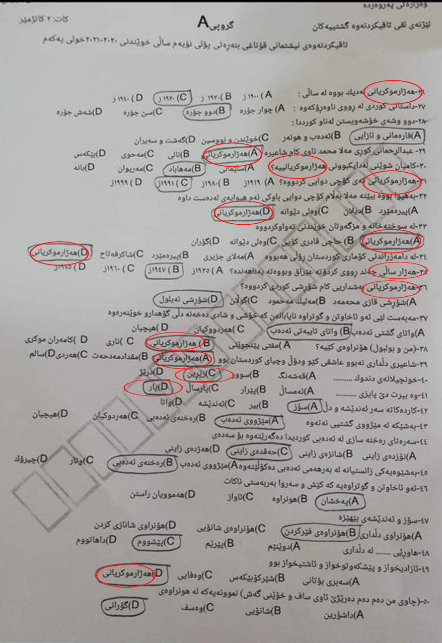 - هێنانەوەی پرسیاری هەڵە، بە نمونە (ئازادی خواز و پێشكەوتووخوازو ئاشتیخواز بووە) چوار بژاردەی داوە (سەبری بۆتانی، بێكەس، وەفایی، هەژار موكریانی)، وەڵامی راست هەژار موكریانیە، واتا ئەو سێ شاعیرەی تر ئازادی خوازو پێشكەوتووخوازو ئاشتیخواز نەبوون.