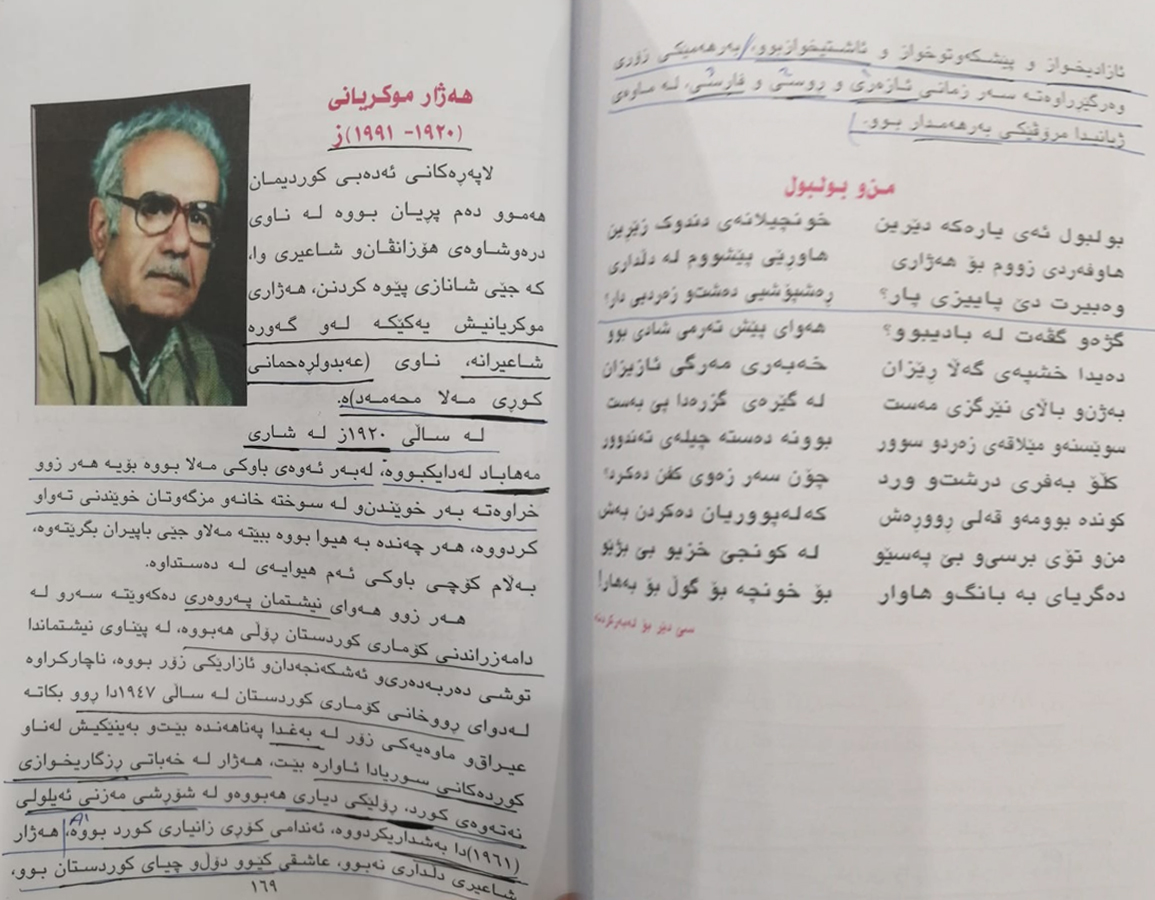 ژیان و بەرهەمەکانی (هەژاری مۆکریانی) لە کتێبی ئەدەبی کوردی پۆلی (٩)ی بنەڕەتیدا تەنیا پەڕەیەکی بۆتەرخان کراوە، واتە بەم پێوەرە زۆریەی پرسیارەکانی وەزارەتی پەروەردە لە یەک پەڕەی کتێبەکەدا دانراوە.