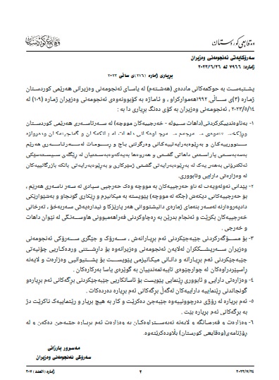 ئەم بڕیارە دوای گەڕانەوەی تیمی یەكێتیی بۆ كۆبونەوەكانی ئەنجومەنی وەزیران دوای 6 مانگ لە بایكۆت دەركرا، قوباد تاڵەبانیو مەسرور بارزانی ئەوكات كۆبونەوە، یەكێتیی وەرەقەیەكی دارایی خستە بەردەم پارتیو مەسرور بارزانی سەرۆكی حكومەت لە كۆبونەوەی 24ی ئایاری ئەمساڵی حكومەتدا پەسەندی كردو كرا بە بڕیار.