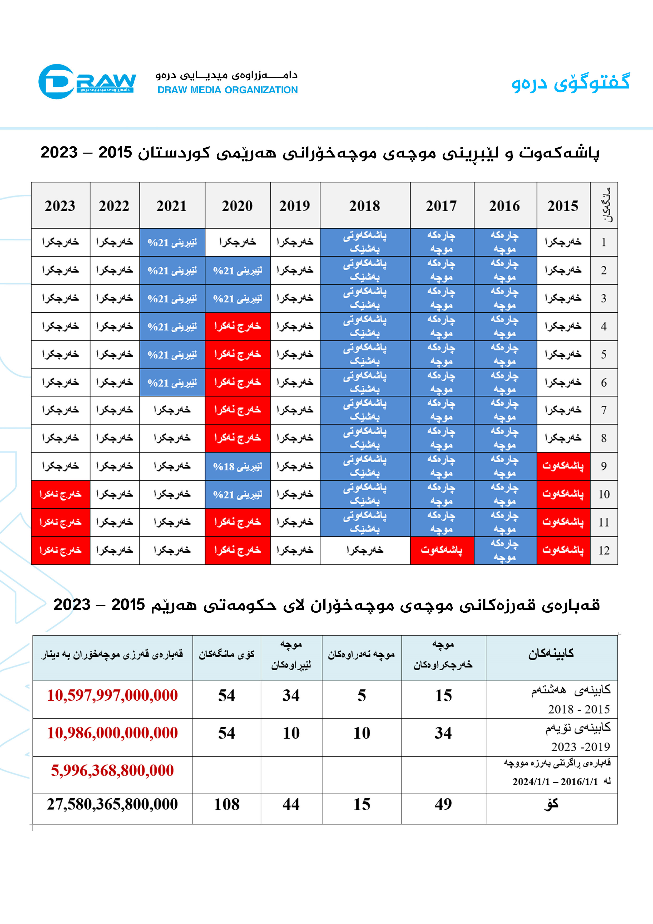 حكومەی هەرێمی كوردستان: 27ترلیۆن و 580ملیارو 365ملیۆن دینار قەرزاری موخۆرانە