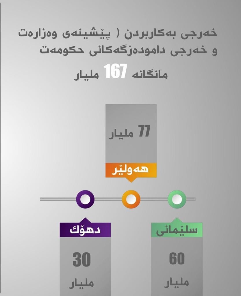 • خەرجی وەزارەتەكان و دام و دەزگاكانی حكومەتی هەرێمی كوردستان بە پێی راگەیەندراوی وەزارەتی دارایی مانگانە پێویستی بە (167) ملیار دینار كە لە (200) ملیار دیناری داهاتی ناوخۆ خەرجدەكرێت، واتا بە لێكدانەوەی ژمارە فەرمییەكانی وەزارەتی دارایی داهاتی كاشی مانگانە (200) ملیار دینارەو (167) ملیار دیناری بۆ خەرجی وەزارەتەكان دەڕوات واتا (33) ملیار دیناری دەمێنێتەوە.