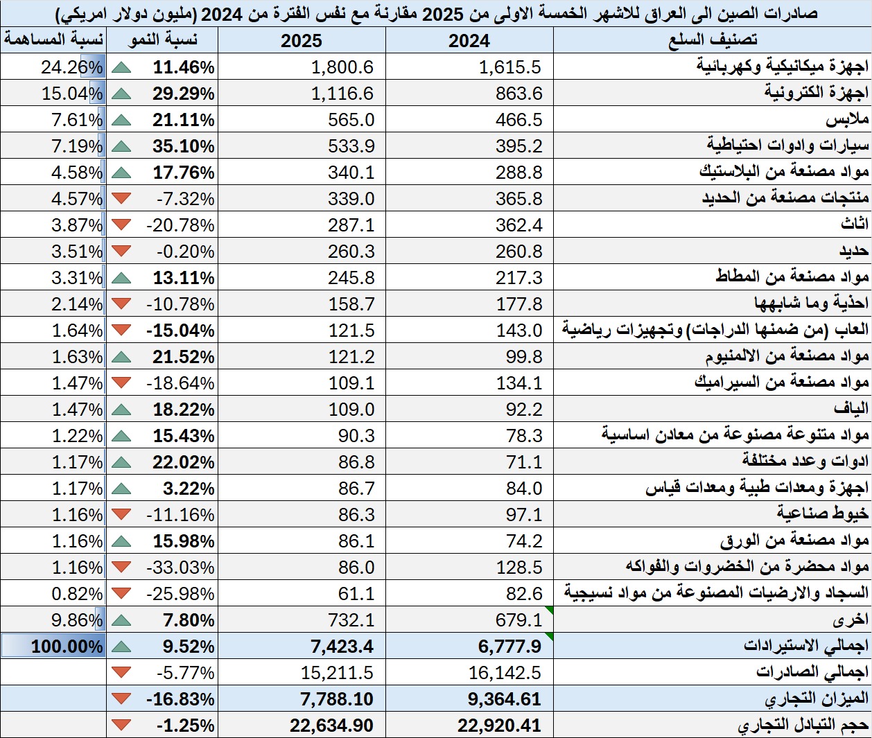 • ئامێرە كارەبایی و میكانیكییەكان: كە رێژەی 24%ی تێكڕای هەناردەی چین بۆ عێراق پێكدەهێنێت و بەرێژەی 11.46% بەرزبوونەوەی بەخۆوە بینیوە.