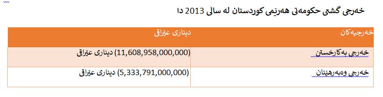 کەواتە ڕێژەی بودجەی حکومەتی هەرێمی کوردستان بۆ ساڵی 2013 بەم شێوەیە بووە: 13,492,436,000,000دیناری عێراقی