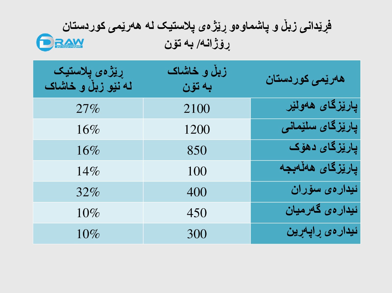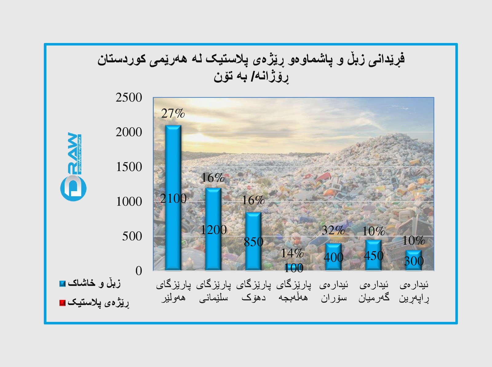لە هەرێمی کوردستان ڕۆژانە زیاتر لە شەش هەزار و 500 تۆن زبڵ و خاشاک کۆدەکرێتەوە کە زیاتر لە هەزار و 500 تۆنی پاشماوەی پلاستیکییە و بەشی زۆری ئەمەش دەبەی ئاوی پلاستیکییە.
