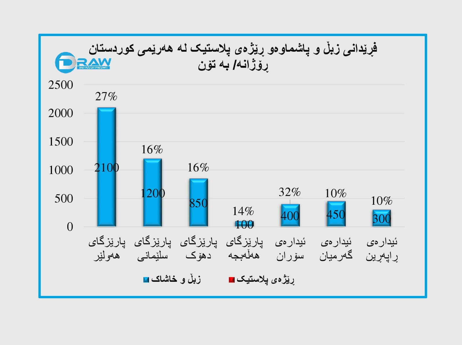 - پارێزگای هەولێر رۆژانە زیاتر لە( ۲۱۰۰ تۆن زبڵ و خاشاک) کۆدەکرێتەوە ۲۷٪ـی  پاشماوە پلاستیکییەکانن.