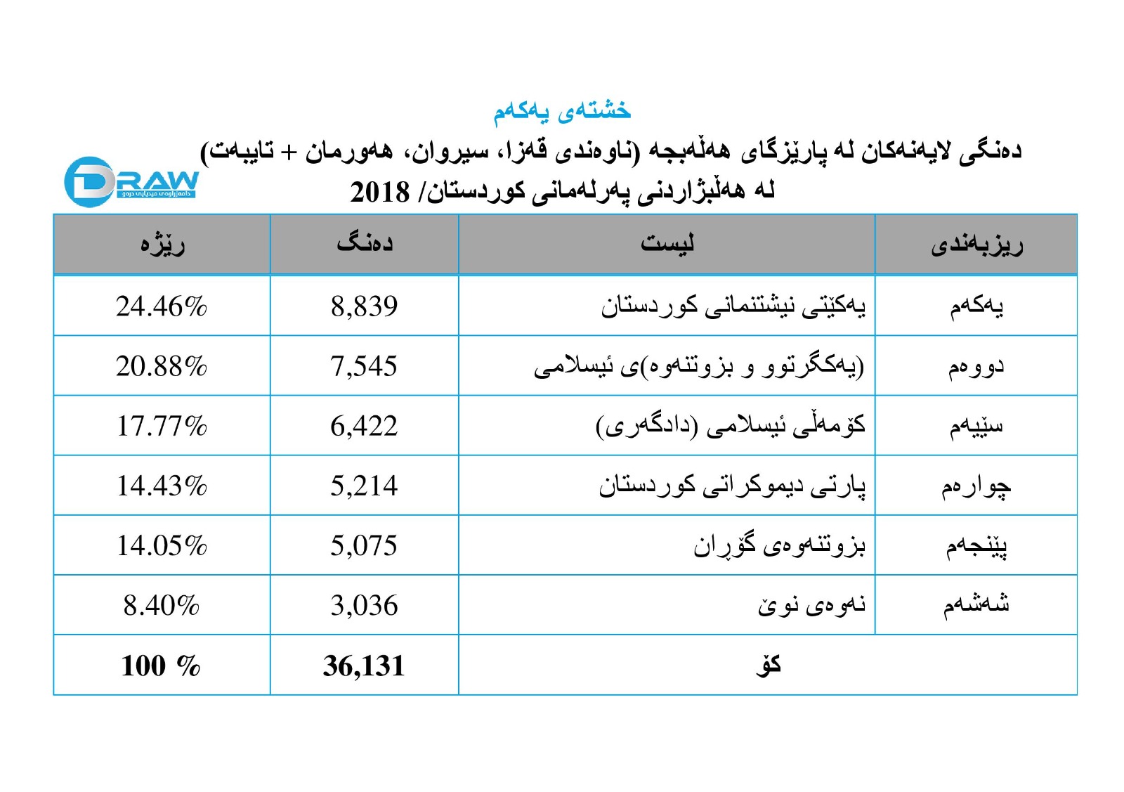 - پارتی دیموکراتی کوردستان لە پلەی چوارەمدا بووەو (5 هەزار و 214) دەنگی بەدەستهێناوە، بە ڕێژەی (14.43%).
