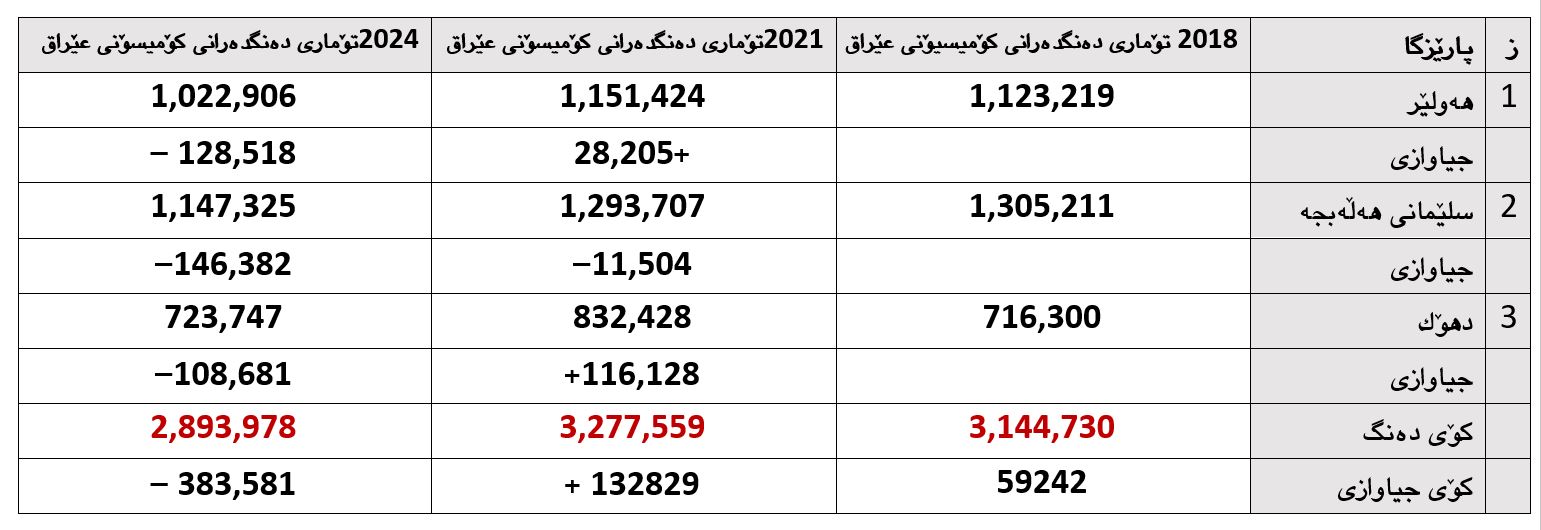 تۆماری دەنگدەران گرنگترین كۆڵەگەی هەر هەڵبژاردنێكە ، دەولەتیش تاكی لایەنەی بەرپرسە لە تۆماری هاوڵاتیانی ، بەپێی ئەو بەڵگەنامەی كە هاوڵاتیانی تۆمار دەكات لەسەر ئەو بنەمایەش ناسنامەیان پێ دەدرێت ، جگە لەوەش دەوڵەت بەرپرسە لە ئەنجامدانی سەرژمێری گشتی ، هۆكاری سەرەكیش نەبوونی داتا و سەر ژمێری لە عێراق دەولەتە ، دوا سەرژمێری لەسەر ئاستی 18 پارێزگا لە ساڵی 1987 ەوە بوو ، ساڵی 1997 سەرژمێری گشتی لەسەر ئاستی 15 پارێزگایەوەبوو ،بەڵام لە دوای پرۆسەی ئازادی عێراق تا ئەمرۆ بە هۆكاری جیاجیا و سیاسی ئەم پرسە بەردەوامی هەیە و سەرژمێری نەكراوە كە بریار وایە ئەم ساڵ بكرێت ، لە ماددەی (110 / 10دەستوور پرسی ئامارو سەرژمێری خراوەتە ژێر دەسەڵاتی تایبتمەندی حكومەتی فیدراڵی ، كەواتە لایەنی كەم تەرخەم لەم بابەتە حكومەتی فیدراڵە ، لە یەكەم خولی هەڵبژاردنی پەرلەمانی كوردستان لە ساڵی 1992 تا ئەمرۆ ژمارەی دانیشتوان وتۆماری دەنگدەران بابەتێكە جێگای پرسیارو ناكۆكیی بوە ، هەم بۆ هەڵبژاردن و هەم پرسی بوجە و بەشی پارێزگاكان ، بێ گومان لەعێراقیش لە دوای پرۆسەی ئازادی تا ئەمرۆ ئەو پرسە بەردەوامی هەیە و خاڵی ناكوكی بوە ، لە یەكەم هەَلبژاردنی دوای پرۆسەی ئازادی عێراق بە ناچاری پەنا برا بۆ داتای كۆمپانیای خۆراك و كرایە بنەما بۆ ئامادەكردنی تۆماری دەنگدەران لە لایەن دەسەڵاتی كاتی هاوپەیمانان ، بەڵام لایەنە سیاسیەكان كۆمێنت و قسەی خۆیان هەبوو لە سەر داتاكان ، لە نێوان كورد و كورد و لە نێوان كوردو عەرەب و لە نێوان عەرەب و عەرەب ،ئەم پرس و بابەتە بەردەوامی هەیە تا ئەمرۆ ، تەنانەت لە عێراق لە دوای پەسەند كردنی دەستووری هەمیشەیی زۆربەی خولەكانی ئەنجومەنی نوێنەران پێشەلی ماددەی 49 /1ی دەستور كراوە ، چونكە لە دەستووردا هاتوە بۆ هەر (100) هەزار هاوڵاتی نوێنەرێكیان دەبێت لە ئەنجومەنی نوێنەران ، هەروەها بوجە لەسەر ئەو بنەمایە دابەش دەكرێت ، بۆیە مافی پارێزگاكان نەدراوە لە نوێنەرایەتی ، هەرچەندە بریارێكی دادگای ئتتحادیە / ژمارە (11) ساڵی 2010هەیە كە گەشەسەندنی ساڵانەی هاوڵاتیانی بە(2,8)دیاریكردوە ، دەكرا بەو بنەمایە ژمارەی دانیشتوان دیاریكرابوایە ، بەڵام بە بریارێكی دادگای فیدرالی ئەم پرسە خراوەتە دوای پرۆسەی سەرژمێری گشتی چونكە ئەگەر ژمارەی دانیشتوانی عێراق 40 ملیۆنبێت ئەوا دەبوایە ژمارەی ئەندامانی ئەنجومەنی نوێنەران 400 ئەندام بوایەو بەپێی ژمارەی دانیشتوانی پارێزگاكان بەسەر پارێزگاكان دابەش بكرێت ، سەبارەت بە تۆماری دەنگدەرانیش یاسا دانەری عێراقی داتای كۆمپانیای خۆراكی كردۆتە بنەما ، كۆمیسیۆنیش لەسەر ئەو بنەمایە تۆماری دەنگدەرانی ئامادە كردوە ، بەڵام چونكە داتایەكی پر لە كەموو كوریە جێگای كۆدەنگی لایەنە سیاسیەكان نەبوە ، هەر چەندە ماوەی 10 ساڵ زیاتر كۆمیسیۆن باڵای سەربەخۆی هەڵبژاردنی عێراق دەستی كردوە بە پرۆسەی تۆماری بایۆمەتری كە تا رادەیەك كارە كانیان بەرو پێش چوە ، گەر بەوردی سەرنجی تۆماری دەنگدەرانی پارێزگاكانی هەرێم بدەین لە ماوەی سێ خولی هەڵبژاردن هەست بەو گۆرانكاریانە دەكەین كە تا رادەیەك بەدیهاتوون ، ئەمەش خالێكی ئەرێنیە بۆ دەنگدەران و حزبە سیاسیەكان ، هەر چەندە كاری لە پێشینە ئەوەیە بۆ خولەكانی داهاتوی هەڵبژاردنەكان داتای فەرمی كارتی نیشتیمانی بكرێتە بنەمای دروست كردنی تۆماری دەنگدەران لە لایەن كۆمسیۆن ، گەر بۆ رونكردنەوەی زیاتر و بەر چاو روونی سەرنجی ئەو خشتەی خوارەوە بدەین ئەوا دەگەینە ئەو باوەرە كە عێراق لەبواری داتا و سەرژمێری و كەم تەرخەمە و زۆر لە دواوەیە ، ، ئەم خشتەی خوارەوە رووبەروی كۆمەڵێ پرسیارمان دەكاتەوە بۆیە شایەنی لێ وردبونەوەیە ، داتای فەرمی كۆمیسیۆنی باڵای سەربەخۆی هەڵبژاردنی عێراق بۆ ساڵی 2018 ، 2021 ، 2024 ، لەسەر ئاستی هەرێمی كوردستان ، كە داتای ساڵی 2018 هەڵبژاردنی ئەنجومەنی نوێنەرانی پێ ئەنجامدراوە ، و داتای 2021 هەڵبژاردنی 2021ی ئەنجومەنی نوێنەرانی پێ ئەنجامدراوە ، 