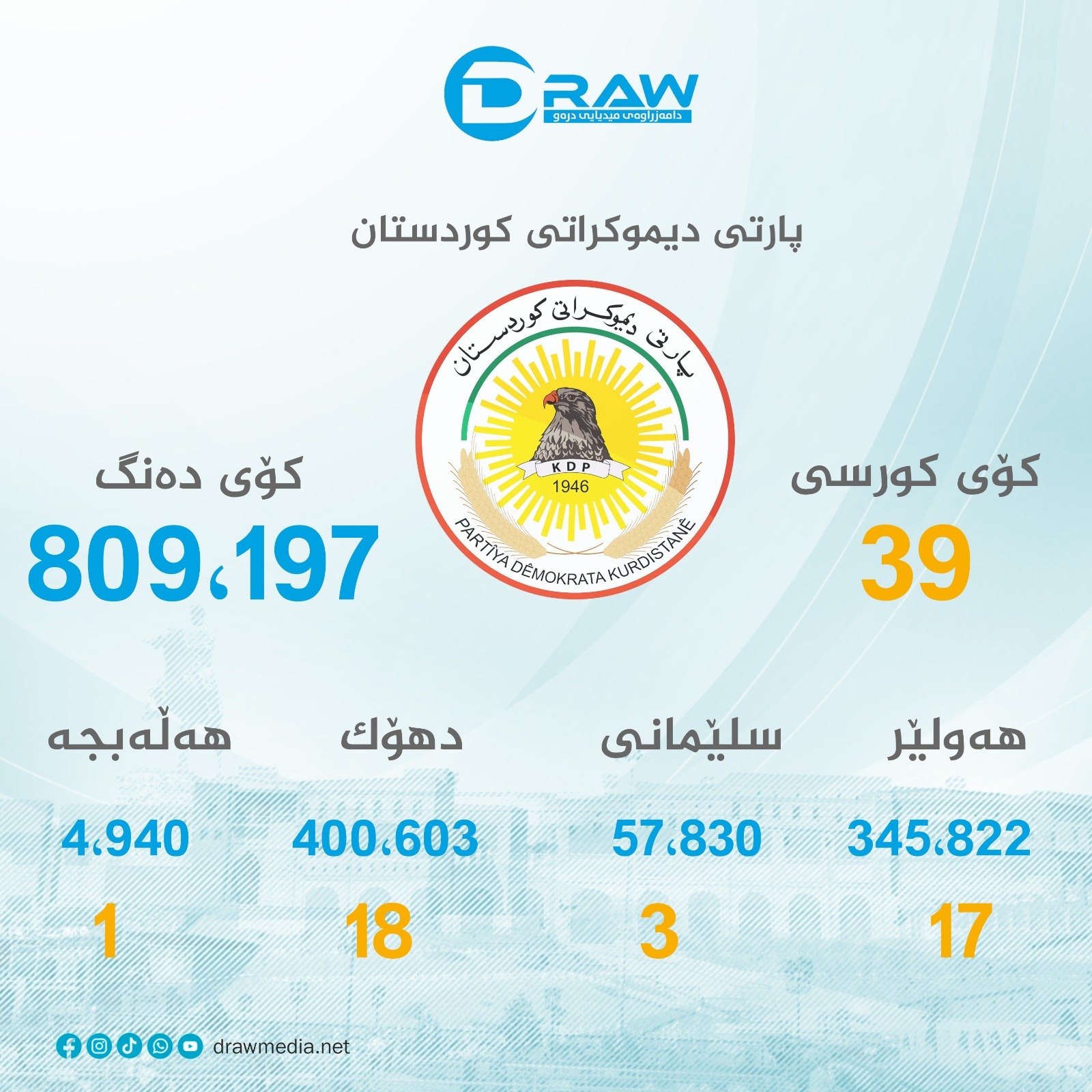 5. هەر بەپێی ئەنجامە بەراییەکان پارتی دیموکراتی کوردستان لەسەر ئاستی هەر چوار بازنەکەی هەرێمی کوردستان (809 هەزارو 197) دەنگی بەدەستهێناوە، بەم ئەنجامەش (39) کورسی پەرلەمانی کوردستان مسۆگەر دەکات، بەجۆرێک.