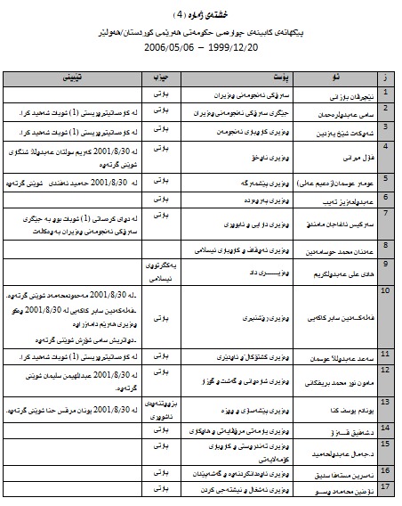 • كابینەی چوارەمی حكومەتی هەرێم/ یەكێتیی لە سلێمانی بە سەرۆكایەتی (د. بەرهەم ئەحمەد ساڵح) لە 20ی كانونی دووەمی 2001 دامەزراو لە 4ی تەموزی 2004و دوای كەوتنی رژێمی سەددام، (عومەر فەتاح) سەرۆكایەتیی كابینەكەی وەرگرت تا یەكخستنەوەی هەردوو حكومەتی پارتی و یەكێتیی لە 2006دا.