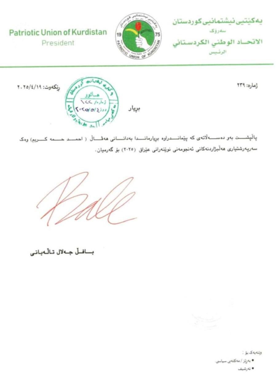 فەرمانی بافڵ تاڵەبانی سەرۆكی یەكێتی، سەرپەرشتیاری ناوچەكانی هەڵبژاردنی پەرلەمانی عێراق دیاریكران، فەرمانەكە لە رۆژی 19/4/2025 دەرچووە بە واژۆی بافڵ تاڵەبانی بۆ سەرپەرشتیاری ناوچەكانی هەڵبژاردن دەرچووە بەم شێوەیە: