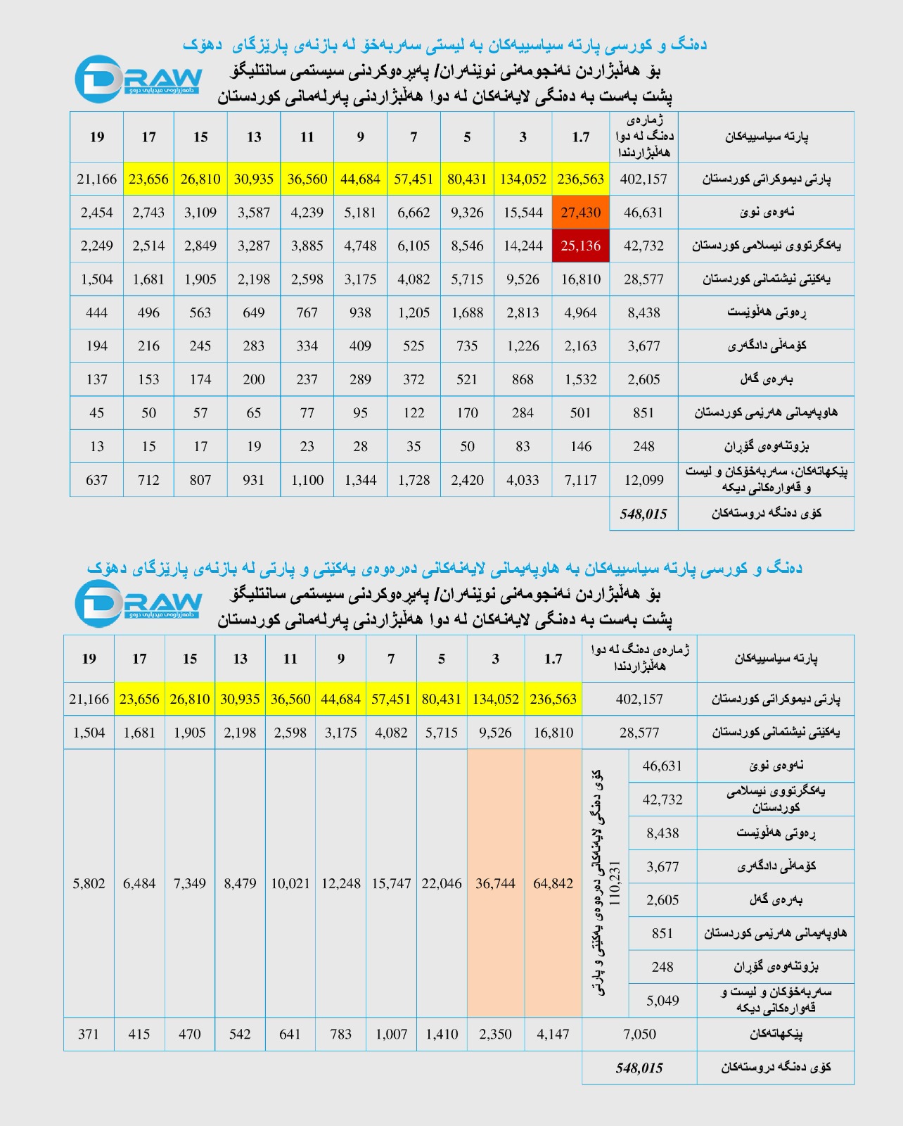 - پارتی دیموکراتی کوردستان (402 هەزار و 157) دەنگی بە ڕێژەی (73%)ی دەنگە دروستەکانی پارێزگاکەی هێنابوو.