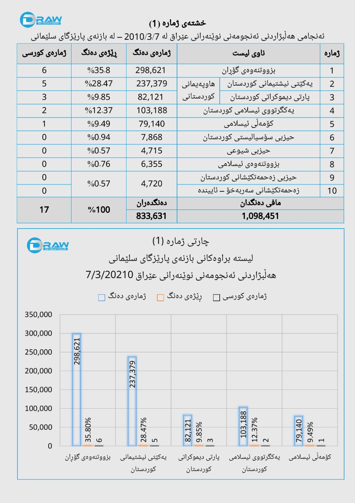 یەكەم/ بازنەی پارێزگای سلێمانی لە هەڵبژاردنی ئەنجومەنی نوێنەرانی عێراق 7/3/2010