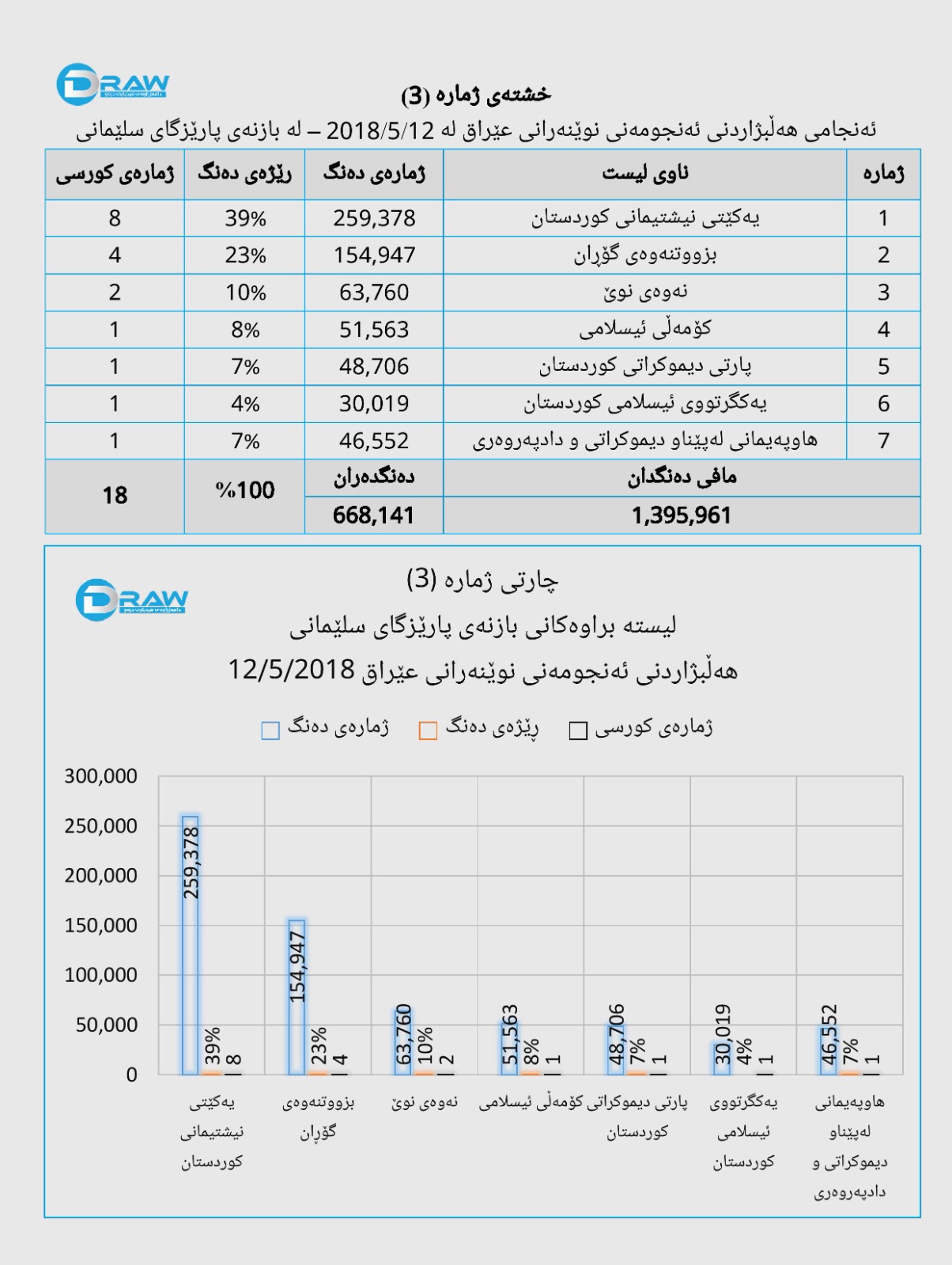 تایبەت بە دەنگی و کورسی لایەنە بەشداربووەکانی بازنەی پارێزگای سلێمانی (بڕوانە خشتە و چارتی ژمارە 3)
