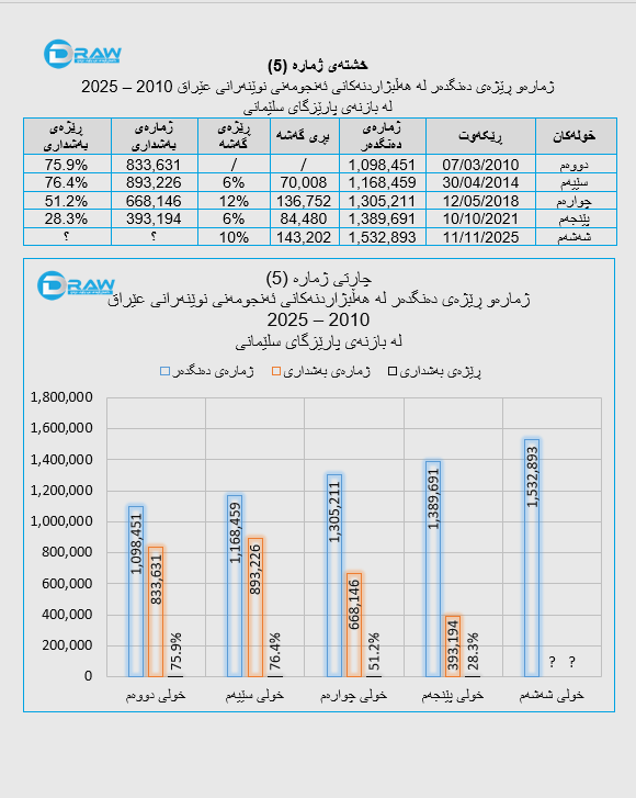 پێنجەم/ ژمارەی دەنگدەر و ڕێژەی بەشداری بازنەی پارێزگای سلێمانی لە هەڵبژاردنەکانی ئەنجومەنی نوێنەرانی عێراق 2010 – 2025