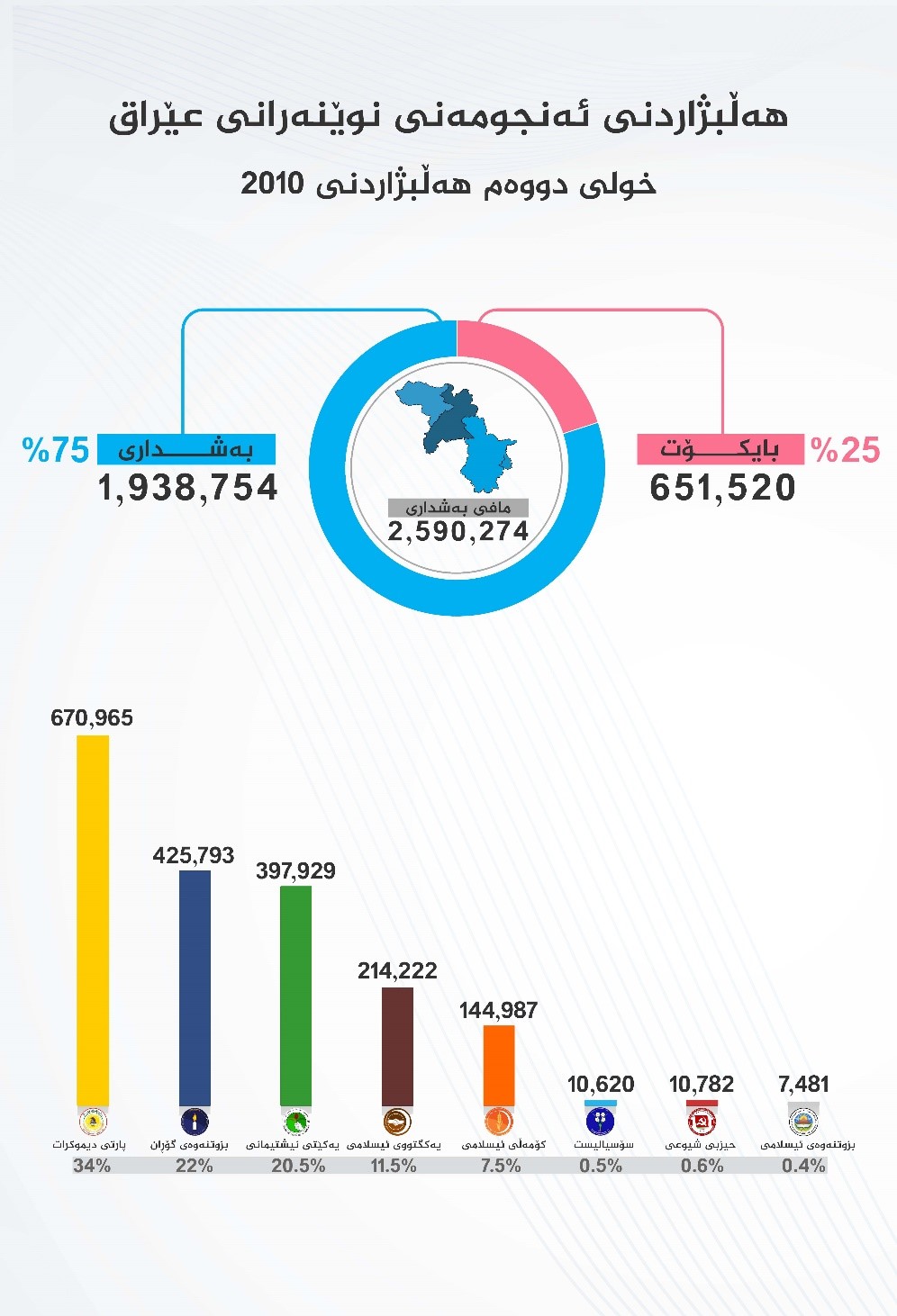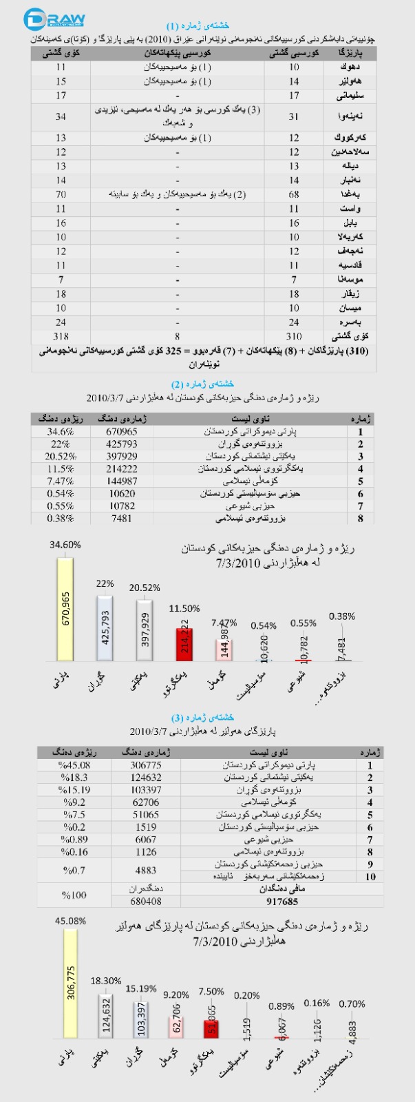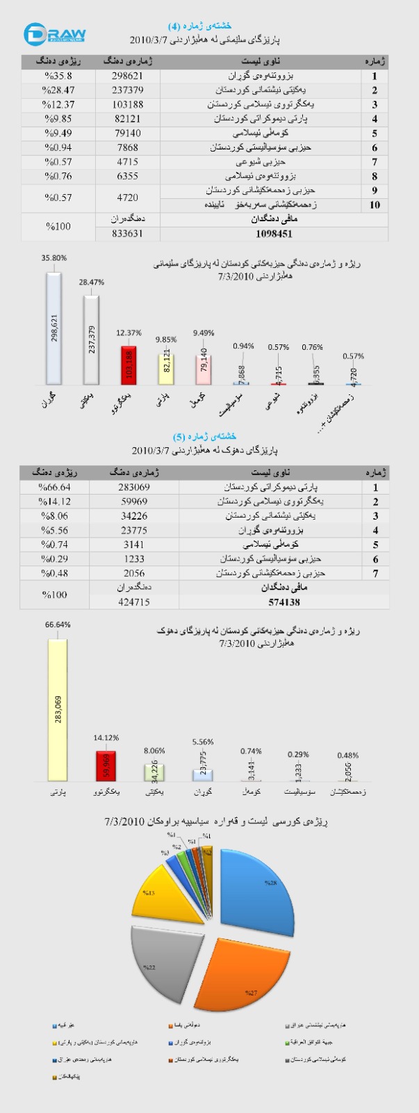 لێرەدا تیشک دەخەینە سەر ئەوە هەڵبژاردنە لە هەرێمی كوردستان لە هەڵبژادنی 7/3/2010دا لە هەرسێ پارێزگای هەرێمی كوردستان (2 ملیۆن و 590 هەزار و 274) مافی دەنگدانیان هەبووە، بەپێی راگەیەنراوی كۆمسیۆنی باڵای هەڵبژاردنەكان (ملیۆنێک و 938 هەزار و 754) كەسیش دەنگیانداوە، واتا رێژەی دەنگدان (74.8%)، بەجۆرێك لە هەولێر (917 هەزار و 685) مافی دەنگدانیان هەبووە و (680 هەزار و 408) دەنگیداوە بە رێژەی (74.1%)، لە سلێمانی (109 هەزار و 8451) كەس مافی دەنگیدانیان هەبووە و (833 هەزار و 631) دەنگیانداوە، بەڕێژەی (75.9%) و لە دهۆكیش كە (574 هەزار و 138) مافی دەنگدانیان هەبووەو (424 هەزار و 715) كەس دەنگیانداوە بەڕێژەی (73.97%).