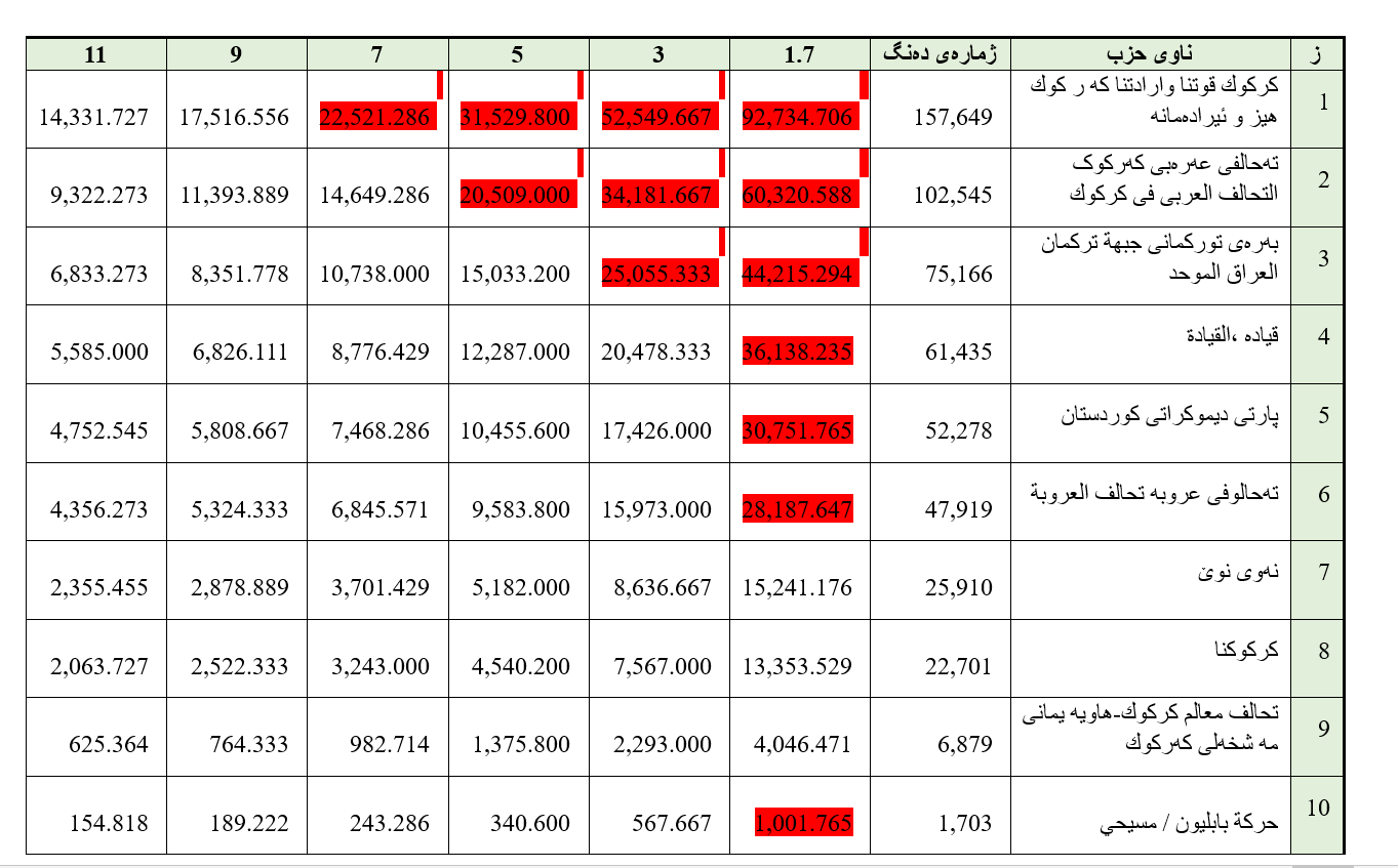 بۆ بەرچاو ڕوونی زیاتر ئەگەر وەک گریمانە ئەنجامەکانی هەڵبژاردنی ساڵی 2023 ی ئەنجومەنی پارێزگای کەرکوک وەک نمونە وەربگرین و بۆ دەرهێنانی ئەنجامی گریمانەیی هەڵبژاردنی ئەنجومەنی نوێنەران ئەنجامەکان بەم شێوەی خوارەوە دەبن؛