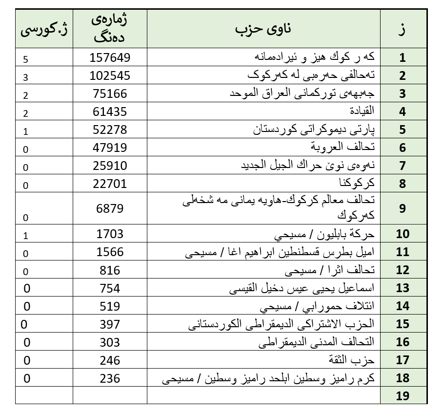 پارێزگای کەرکوک: 12کورسی، لەگەڵ(١) کورسی کۆتایی مەسیحی (13 )هەیە