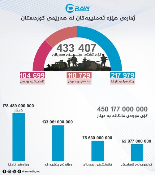 كۆی گشتی هێزی سەربازی: 433 هەزارو 407 كەس دەكاتە (38%)ی كۆی موخۆرانی هەرێمی كوردستان.