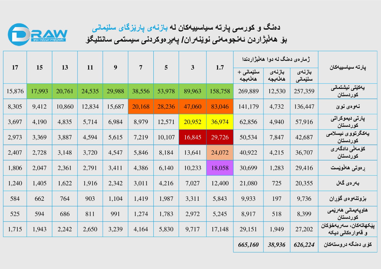 خۆ ئەگەر ئەو ژمارەیە (433) هەزار كەس لە سلكی ئەمنی و سەربازیە (95%)ی دەنگ بدات كە هەڵبژاردنی پێشوو (97%)ی دەنگیاندا دەكاتە (411) هەزار دەنگدەر، لەو رێژەیە (75%)ی دەنگەكانیان بۆ یەكێتی و پارتی بێت (چونكە دەنگی سوتاو زۆر بووە پێشتر تەنیا لەناو هێزە ئەمنییەكان 60 هەزار دەنگی سوتاو هەبوو)، ئەوا دەكاتە (308) هەزار كەس لەو ژمارەیە نیوە بە نیوە بۆ یەكێتی و پارتیش بێت بۆ هەریەكەیان دەكاتە (154) هەزار دەنگ، ئەم رێژەیە بەشیك لە كورسیەكان دەبات.