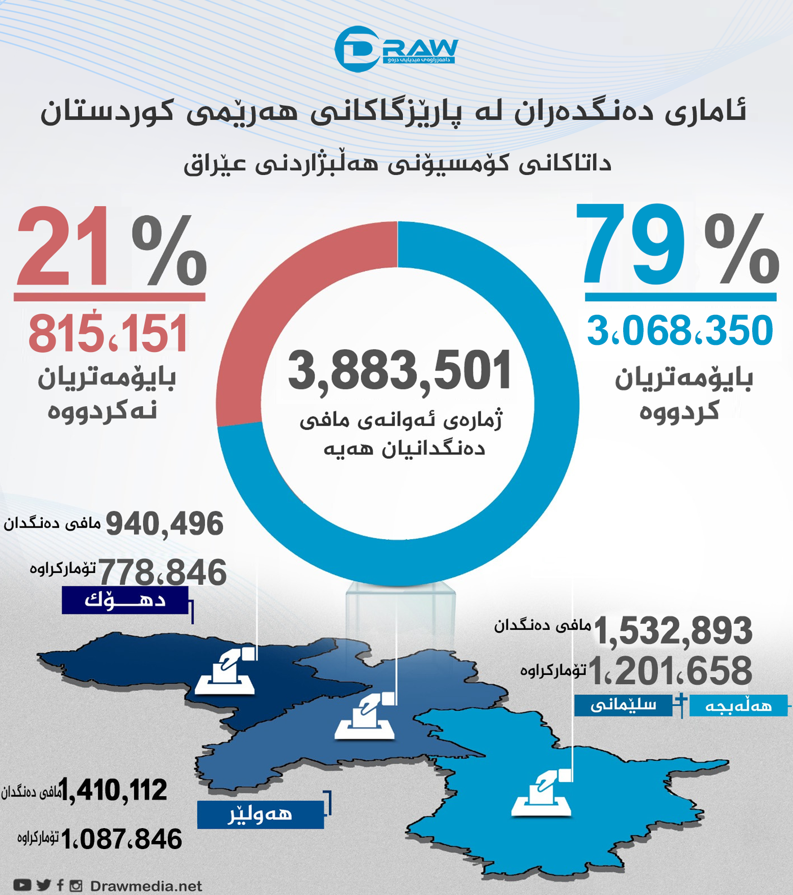لە هەرێمی كوردستان بەپێی راگەیەندراوی فەرمی كۆمسیۆنی باڵای هەڵبژاردنەكانی عێراق (3 ملیۆن و 68 هەزارو 350) كەس كارتی بایۆمەتری نوێكردووەتەوە و مافی دەنگدانی هەیە ,(815 هەزارو 151) كەس بایۆمەتریان پڕنەكردووەتەوەو بەشداری ناكەن. لەو ژمارەیە (224 هەزارو 333) كەسی دەنگدەری تایبەتە بەڕێژەی (7%) و (2 ملیۆن و 844 هەزارو 51) كەسی دەنگدەری گشتیە بەڕێژەی (93%).