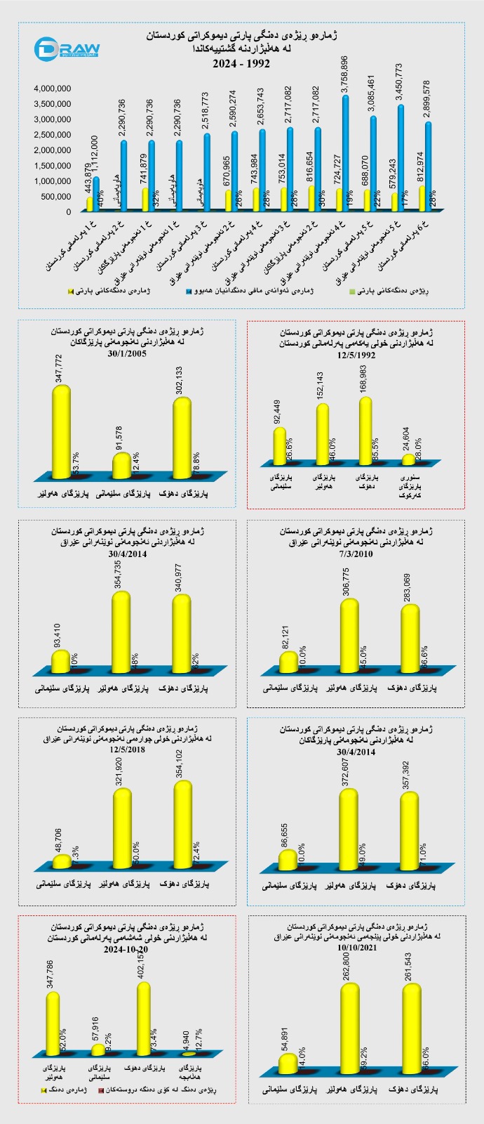 دەنگەکانی پارتی دیموکراتی کوردستان لە هەڵبژاردنەکانی ڕابردوودا - بە گرافیک-