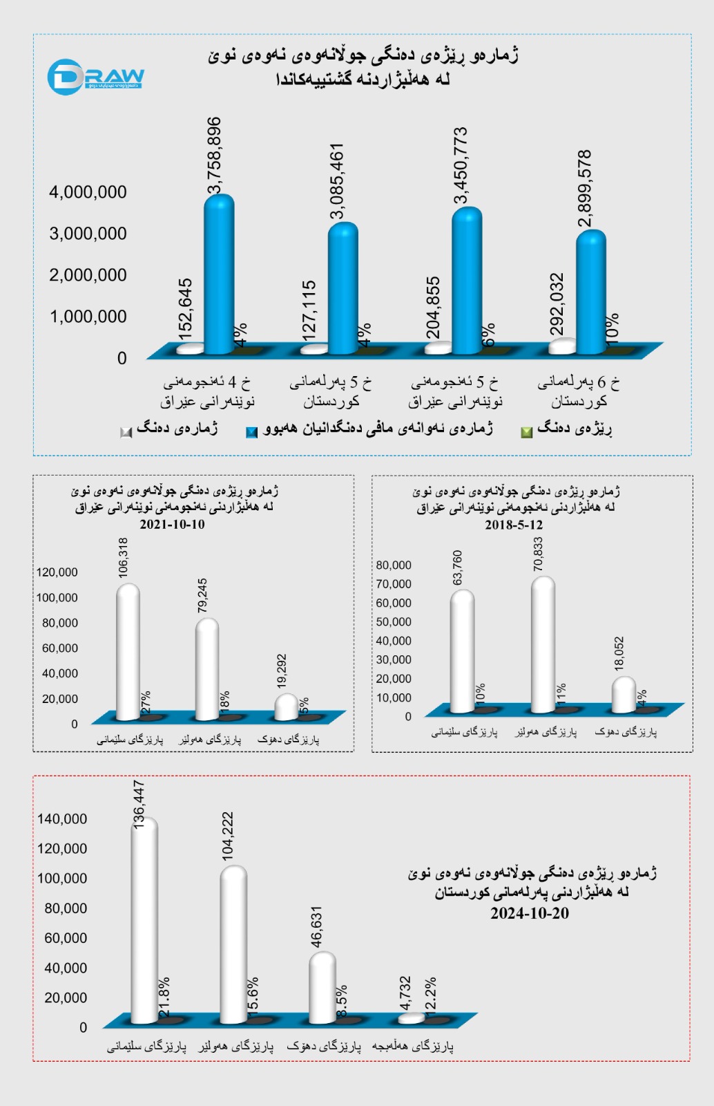 ? لە هەڵبژاردنی 10/10/2021 لەسەر ئاستی هەرسێ پارێزگاکەی هەرێم (204 هەزار و 855) دەنگی بەدەستهێناوە، واتە ژمارەی دەنگەکانی لەم هەڵبژاردنە (52 هەزار و 210) دەنگ بە ڕێژەی (34%) زیادی کردووە.