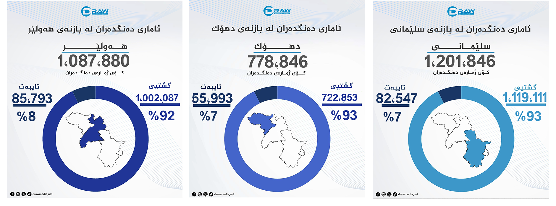 - بازنەی هەولێر (89 هەزارو 791) كەس مافی دەنگدانی هەبووە لە دەنگدانی تایبەتدا (97%) دەنگی داوە وتا (87 هەزارو 513) كەس.