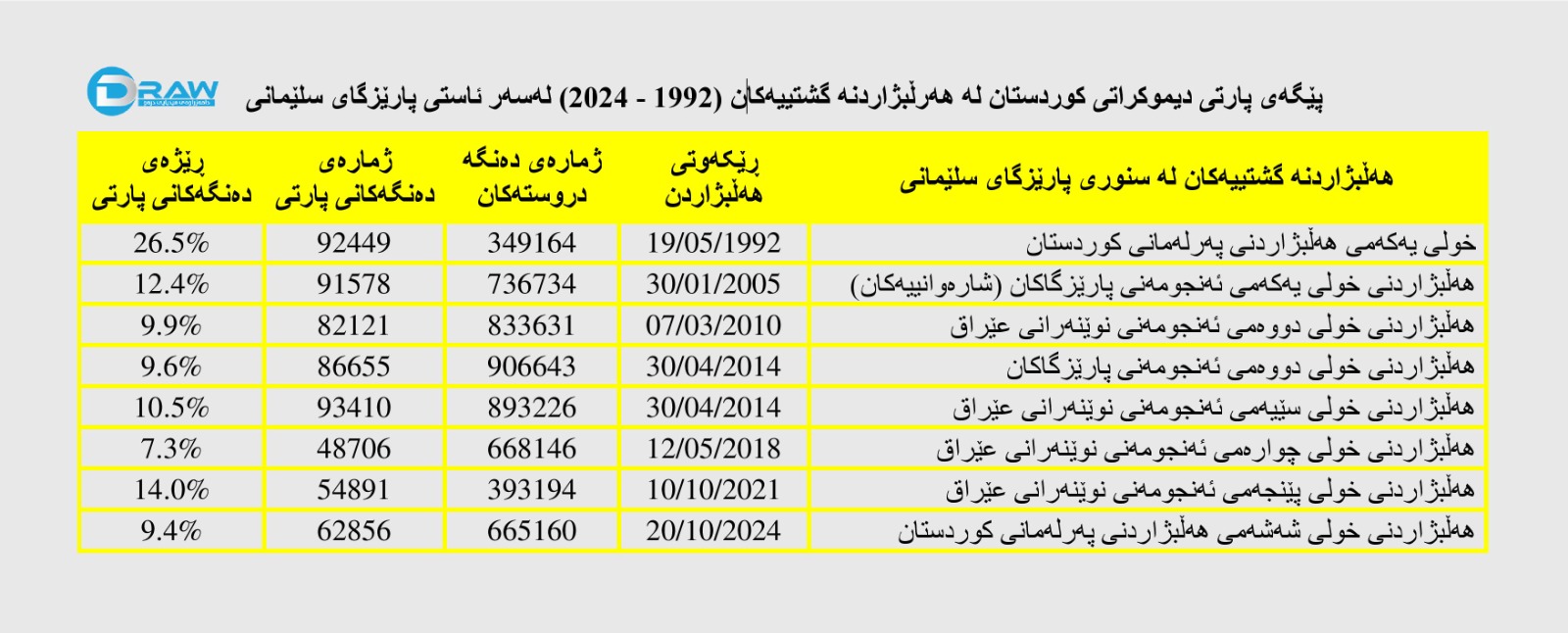 ? سەرەڕای ئەوەی لە ماوەی (32) ساڵی ڕابردوودا و لە ساڵانی (1992 بۆ 2024)، بڕی گەشەی بەشداری هاوڵاتیان لە هەڵبژاردنە گشتییەکان، لە سنوری پارێزگاکانی سلێمانی و هەڵەبجە بۆ نزیکەی دوو هێندەو بە ڕێژەی (91%) زیادی کردووە، بەڵام ژمارەی دەنگەکانی پارتی دیموکراتی کوردستان، لە سەروو (92 هەزار) دەنگەوە بۆ نزیکەی (66 هەزار و 500) دەنگ بە ڕێژەی (32%) دابەزیوە.