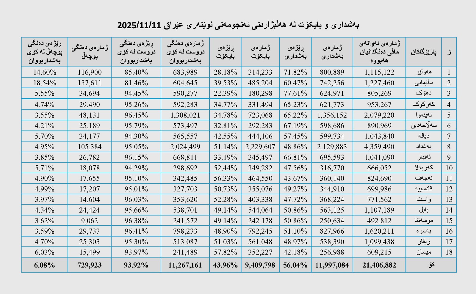 - لەسەر ئاستی عێراق لە کۆی (21 ملیۆن و 406 هەزار و 882) کەس (11 ملیۆن و 997 هەزار و 84) کەس بە ڕێژەی (56٪) بەشدارییان کردووە، (11 ملیۆن و 267 هەزار و 161) کەس بە دروستی دەنگیان داوە بە ڕێژەی (93.9٪) و (729 هەزار و 923) بە ڕێژەی (6٪) پوچەڵ بوونە.