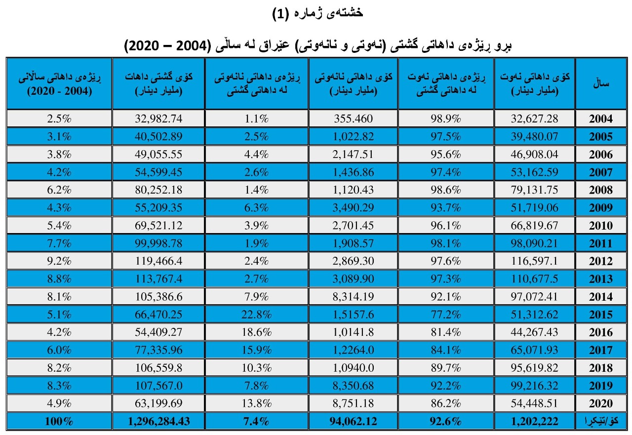 1. کۆی گشتی داهات بریتی بووە لە (1 بلیار و 296 ترلیۆن و 284 ملیار) دینار، کە داهاتی نەوت بڕی (1 بلیار و 202 ترلیۆن و 222 ملیار) دیناری بەڕێژەی (93%) پێکهێناوە.