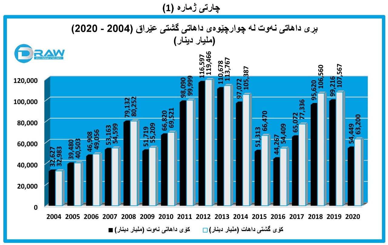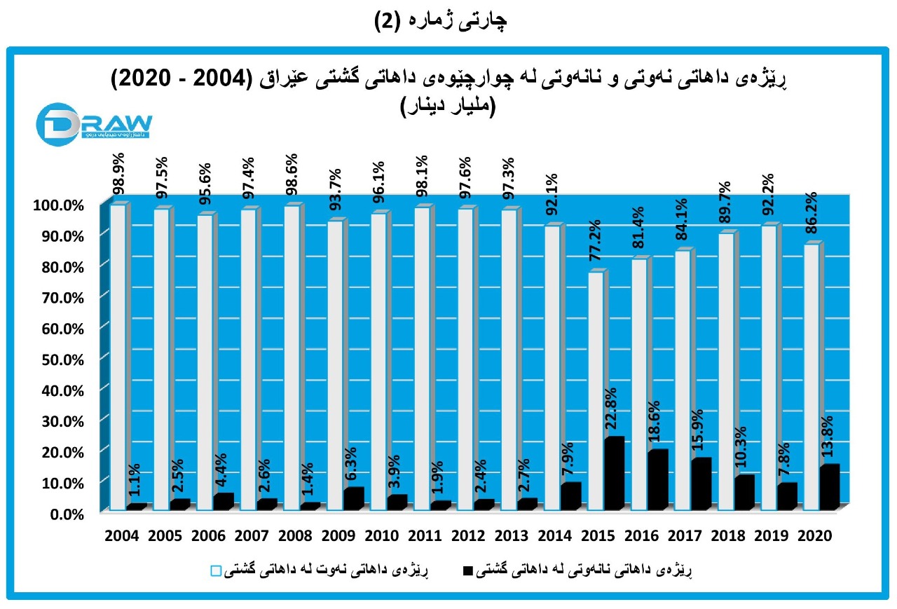 4. داهاتی گشتی عێراق بەشێوەیەکی سەرەکی پشت بە داهاتی نەوت دەبەستێت، جگە لە ساڵانی (2015، 2016، 2017 و 2020) لە سەرجەم ساڵەکانی دیکە بەڕێژەی (90%) و زیاتر داهاتی نەوت داهاتی گشتی پێکهێناوە. (بڕوانە: خشتەی ژمارە (1) و چارتی ژمارە (1 و 2))