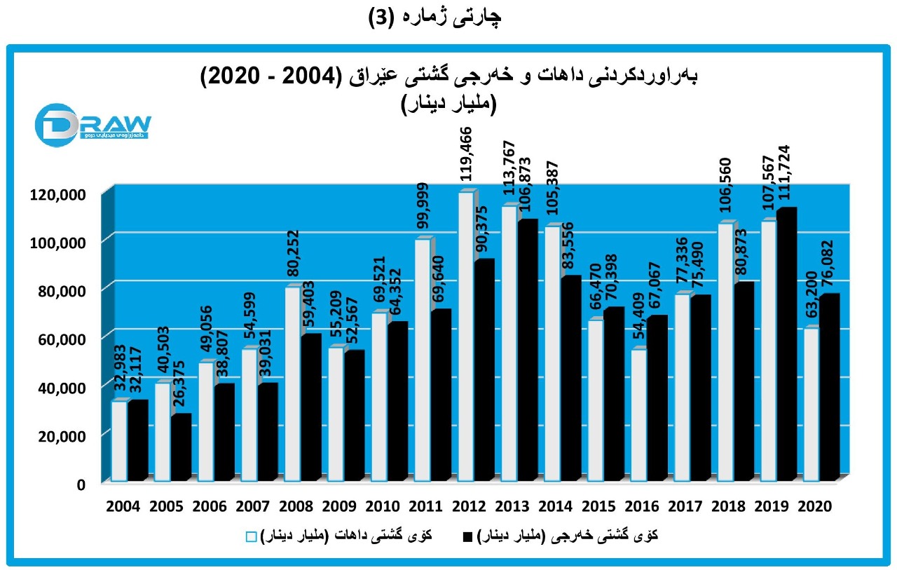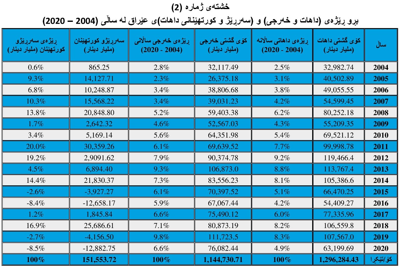 بەپێی داتاکانی بانکی مەرکەزی عێراقی، داهات و خەرجی، بڕی کوتهێنان و سەرڕێژی داهات لە ماوەی ساڵانی (2004 – 2020) بەم شێوەیە بووە؛