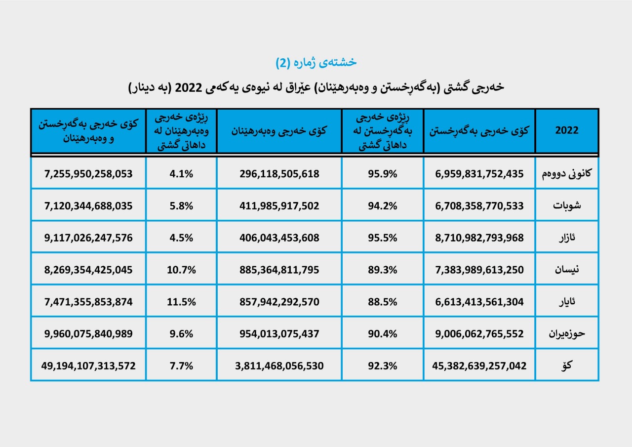 2. سەرۆکایەتی کۆمار بڕی (23 ملیار و 367 ملیۆن و 520 هەزار و 135) دیناری خەرجکردووە، سەرجەم خەرجییەکانی لە بابی خەرجی بەگەڕخستن بووە.