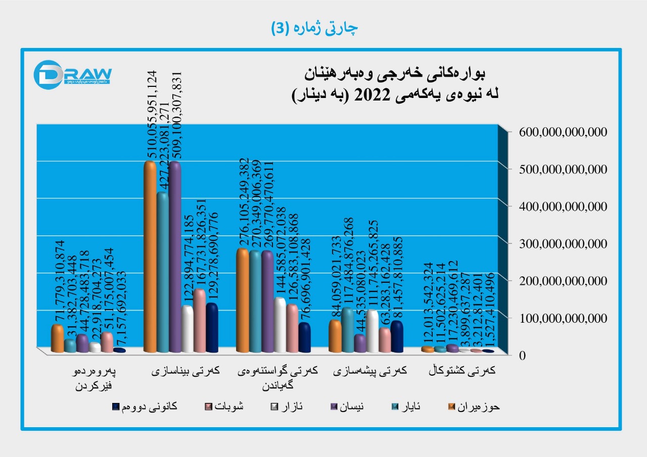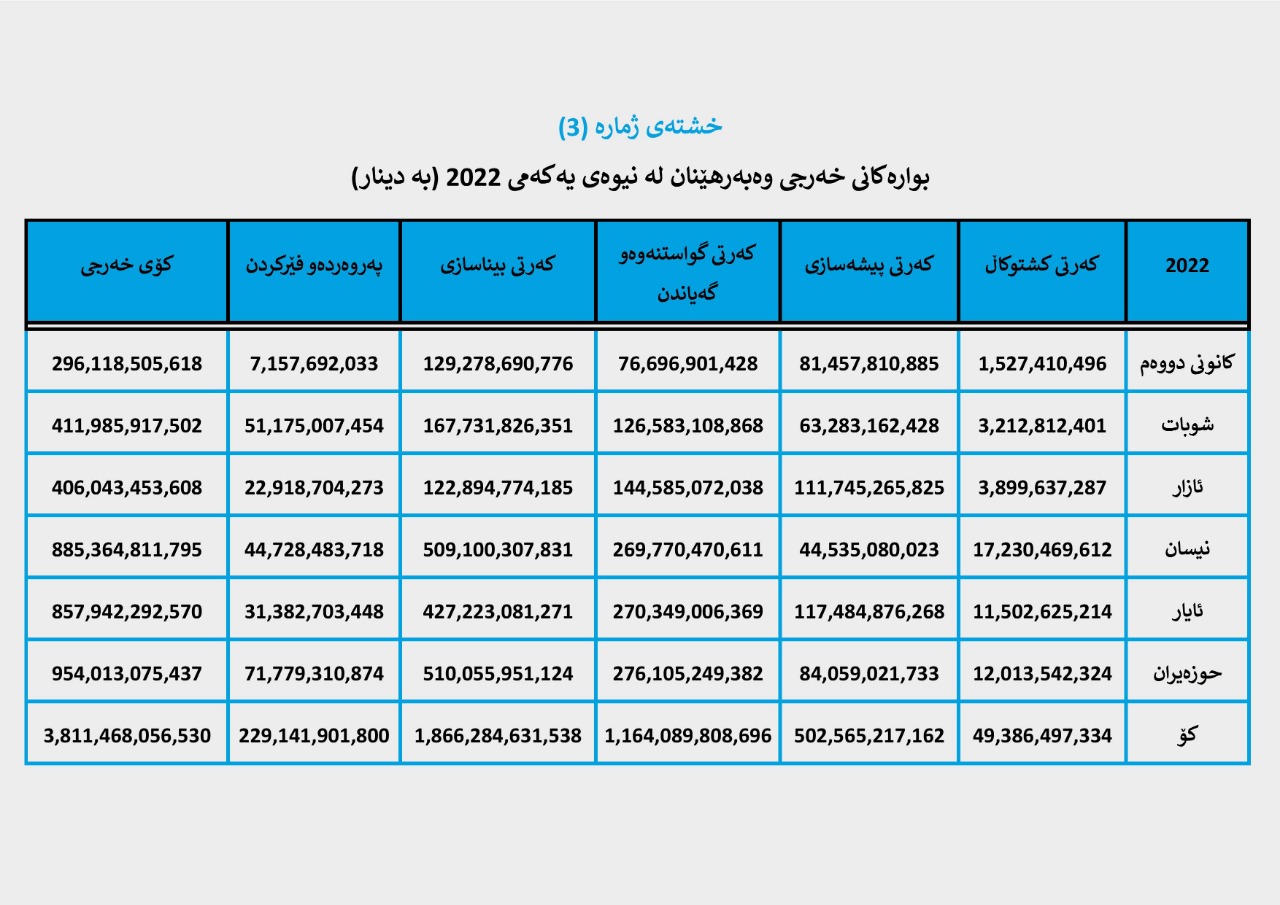 بۆ وردەکاری خەرجییەکانی وەبەرهێنان لە کەرتە جیاوازەکان لە نیوەی یەکەمی ساڵەکە بڕوانە (خشتە و چارتی ژمارە (3)).