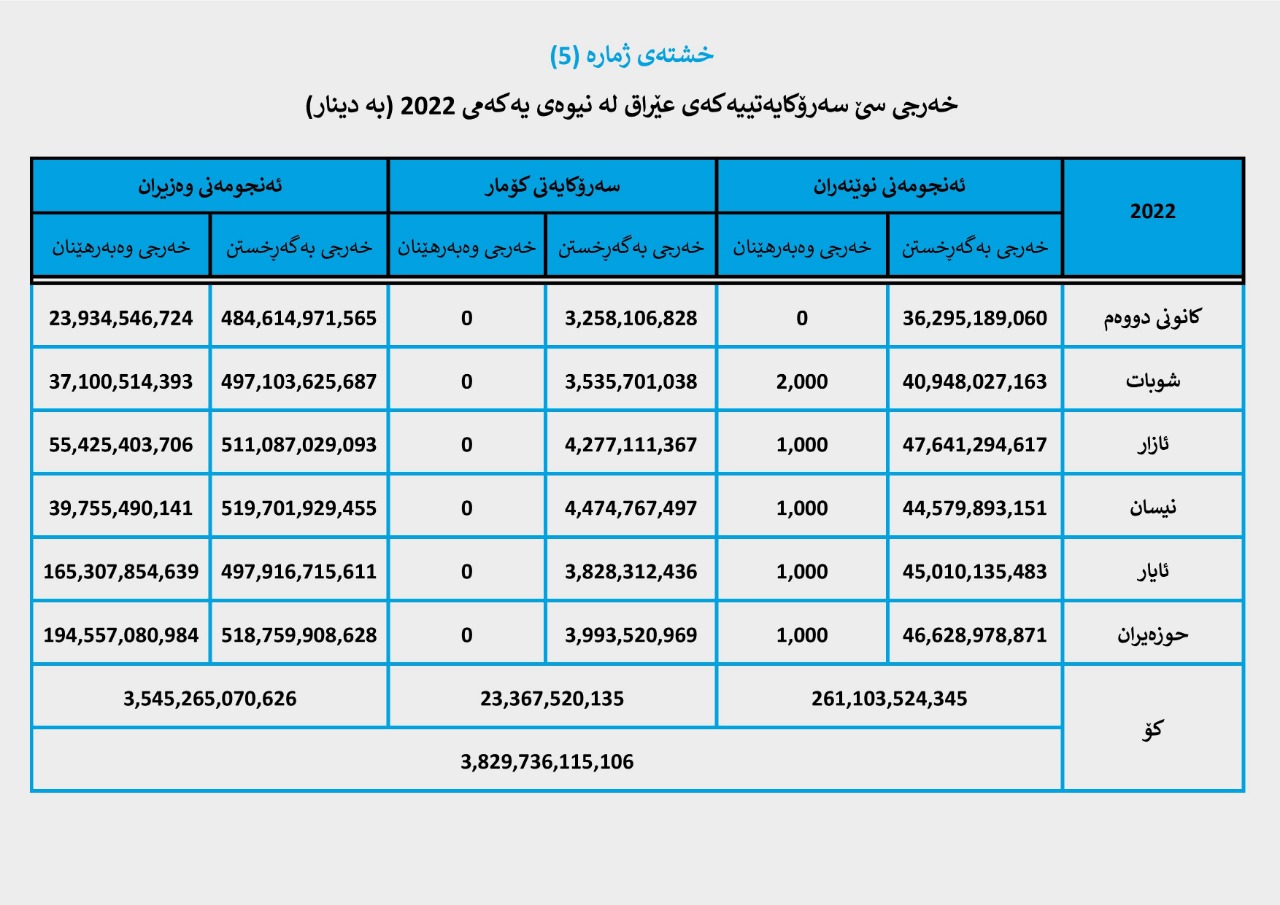 بۆ وردەکاری خەرجی سێ سەرۆکایەتییەکە لە شەش مانگی یەکەمی ساڵی (2022) بڕوانە (خشتە و چارتی ژمارە (5)).