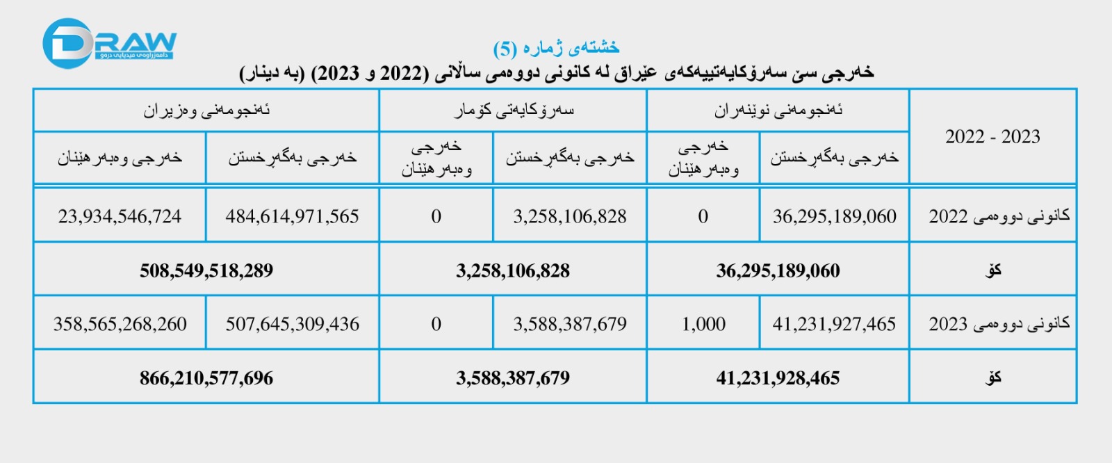 1. ئەنجومەنی نوێنەران لە کانونی دووەمی (2023) بڕی (41 ملیار و 231 ملیۆن و 928 هەزار و 465) دیناری خەرجکردووە. بەڵام لە کانونی دووەمی (2022)دا بڕی (36 ملیار و 295 ملیۆن و 189 هەزار و 60) دیناری خەرجکردووە.