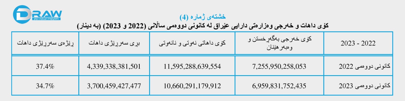 ? هەر بەپێی ئامارەکان دوای لێدەرکردنی سەرجەم خەرجییەکان لە کۆی داهاتی گشتی وەزارەتی دارایی لە مانگی کانونی دووەمی (2023) بەڕێژەی (34.7%) و زیاتر لە (3 ترلیۆن 700 ملیار) دینار داهات لە خەرجی زیاتر بووە و سەرڕێژی کردووە. بەڵام لە ساڵی ڕابردوودا سەرڕێژی داهاتەکە زیاتر بووە و گەیشتووە بە زیاتر لە (4 ترلیۆن و 339 ملیار) دینار بە ڕێژەی (37.4%).