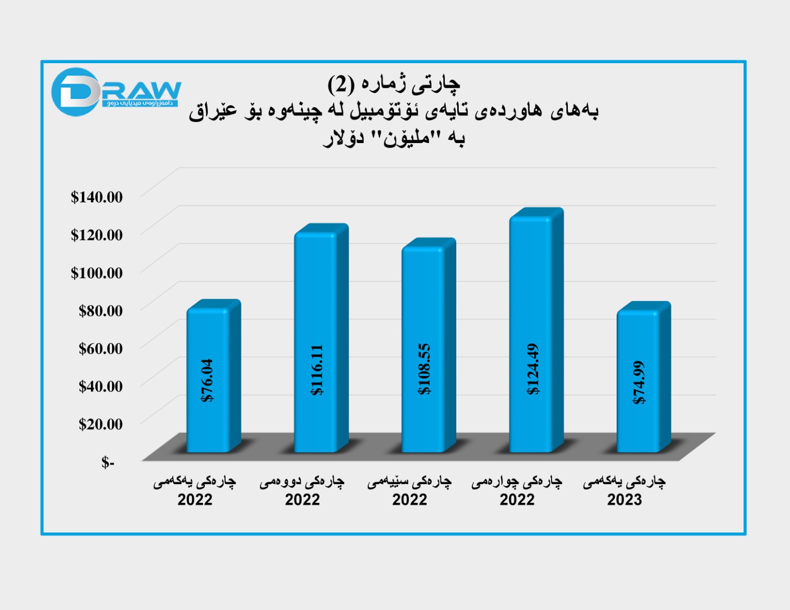 بەهای هەناردەی "چین" لە چارەکی یەکەمی ساڵی(2023) دا (ملیۆنێک و ٩٠٠ هەزار) تایە بووە، بە بەهای (75 ملیۆن) دۆلار، بە بەراورد بە چارەکی چوارەمی ساڵی (2022) کە نزیکەی (2 ملیۆن 800 هەزار) تایە بووە، بە بەهای (125 ملیۆن) دۆلار، بەڕێژەی (39%)دابەزیوە. بەڵام بەراورد بە چارەکی یەکەمی ساڵی (2022) دابەزینەکە بە ڕێژەی (1.38%)بووە، بەو پێیەی ژمارەی تایەی هاوردەکراو گەیشتووەتە (2 ملیۆن 120 هەزار) تایەی هاوردەکراو، بە بەهای (76 ملیۆن) دۆلاری ئەمریکی. بڕوانە (چارتی ژمارە (2)).