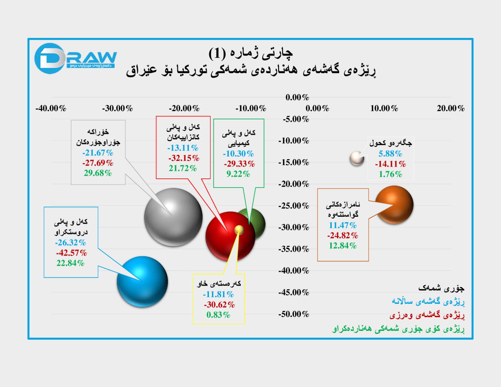 پاڵپشت بە داتاکانی دامەزراوەی ئایندەیی عێراق (مٶسسە عراق المستقبل -Iraq Future Foundation) هەناردەی شمەکی تورکیا بۆ عێراق لە چارەکی یەکەمی ئەمساڵدا لەسەر بنەمای وەرزی بەڕێژەی 17% و لەسەر بنەمای ساڵانە بەڕێژەی 32% دابەزینی بەخۆیەوە بینیوە.