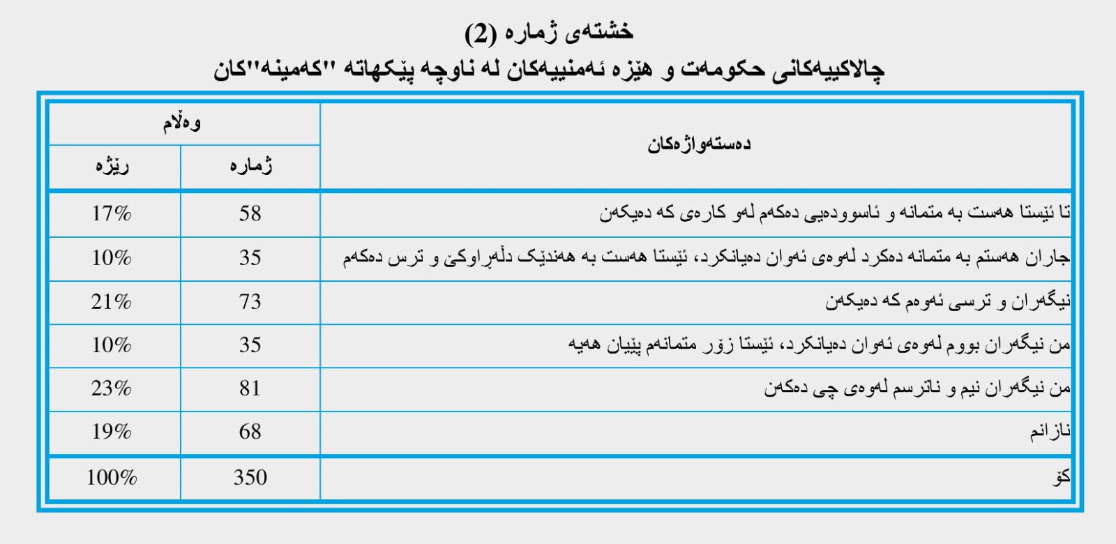 وەک لە خشتەی ژمارە (1)دا هاتووە؛ دەرئەنجامی وەڵامی بڕگەی یەکەم کە ئەو گەرەنتییە کۆمەڵایەتییانەی دەستووری عێراق بۆ ژنانی کەمینەکان ڕوون دەکاتەوە، دەرکەوتووە، کە دوودڵی هەیە سەبارەت بەم بابەتە، چونکە دڵنیا نین لەو گەرەنتییە کۆمەڵایەتیانەی کە دەستوور وەک ژنانی کۆمەڵگەی کەمینەکان پێشکەشیان دەکات، بەڵگەکانیش هەروایە کە (133) وەڵامدەرەوە وەڵامی بژاردەی (هاوڕا نیم)یان داوەتەوە بە ڕێژەی (37.4%).