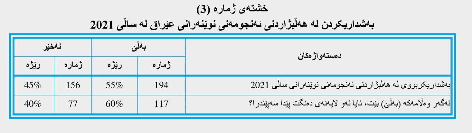 وەک لە خشتەی ژمارە (3)دا هاتووە؛ ئەم بڕگەیە پەیوەستە بە بەشداری ژنانی کەمینەکان لە هەڵبژاردنی ئەنجومەنی نوێنەران ساڵی 2021. ئەنجامەکان ئاماژەیان بەوە کردووە کە (194) وەڵامدەرەوە، بە ڕێژەی (55.4%)، بەرزترین ڕێژەیە بۆ بژاردەی (بەڵێ)، ئەمەش ئاماژەیە کە ئەم بەشداریکردنە لە ئەنجامی زیادبوونی هۆشیاری کەمینەی ژنانە لە قۆناغی دوای داعشدا، بەڵام ڕێژەیەی بەشداریان کردووە بەشی هەرەزۆریان و (117) کەسیان بە ڕێژەی (60%) ئاماژەیان بەوە داوە کە ئەوە لایەنەی دەنگیان پێداوە بەسەریاندا سەپێندراوە، ئەمەش نیشاندەرێکی زۆر مەترسیدارە کە بوونی هەندێک لایەن نیشان دەدات کە سەپاندنی بەسەر کەمینەکان بۆ دەنگدان.