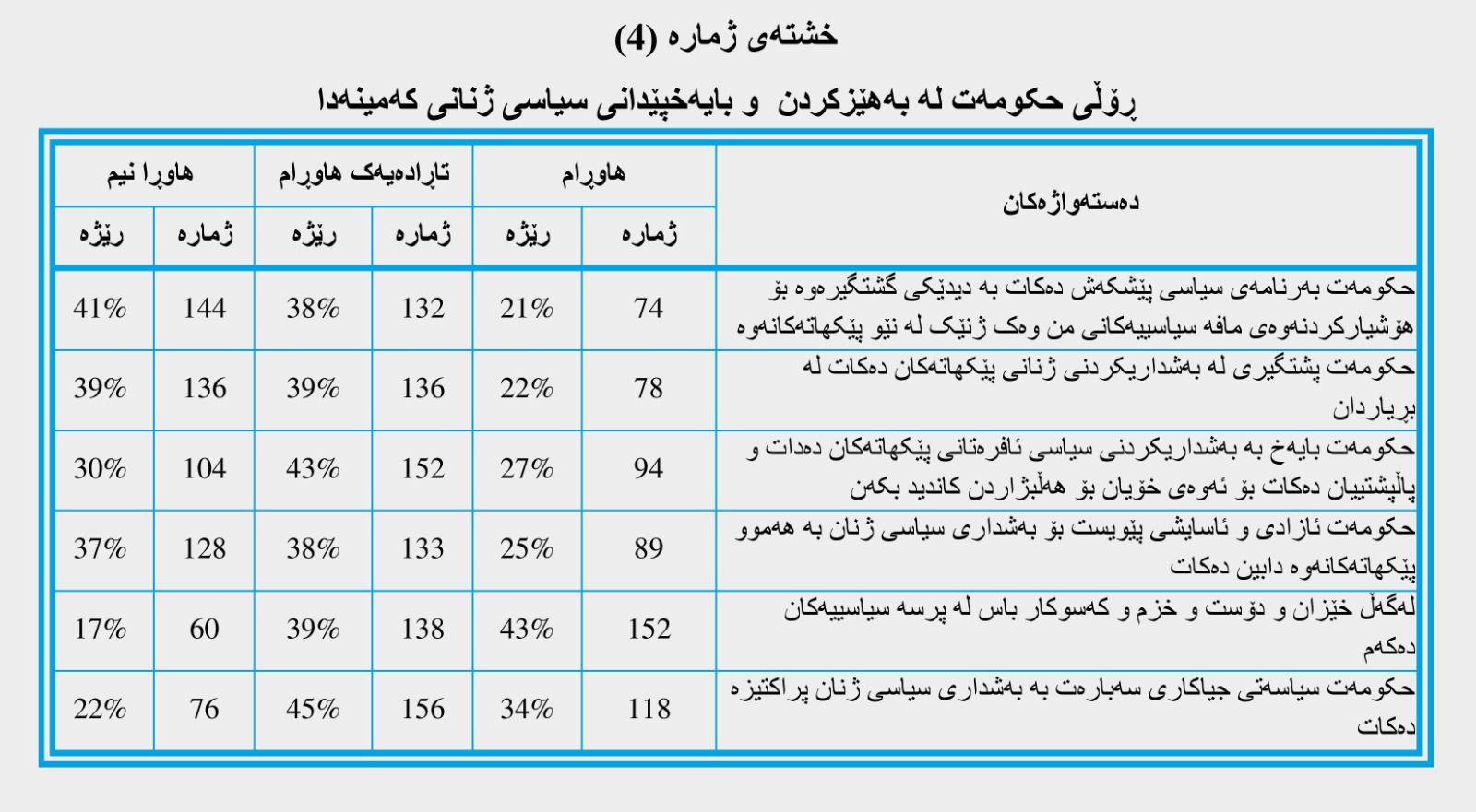 وەک لە خشتەی ژمارە (4)دا نیشاندراوە؛ دەرئەنجامی وەڵامی بڕگەی یەکەم پەیوەست بوو بەوەی کە ئایا حکومەت بەرنامەی سیاسی پێشکەش دەکات بۆ پەروەردەکردنی ژنانی کەمینەکان سەبارەت بە مافە سیاسییەکانیان، بەو پێیەی (144) وەڵامدەرەوە بە ڕێژەی (41%) بەرزترین ڕێژەیە بۆ بژاردەی (هاوڕانیم)، ئاماژەیە بۆ نەبوونی بایەخدانی حکومەت لە بەرنامە سیاسییەکانی لەپێناو بەرزکردنەوەی هۆشیاری سیاسی لەم توێژەی کۆمەڵگادا.