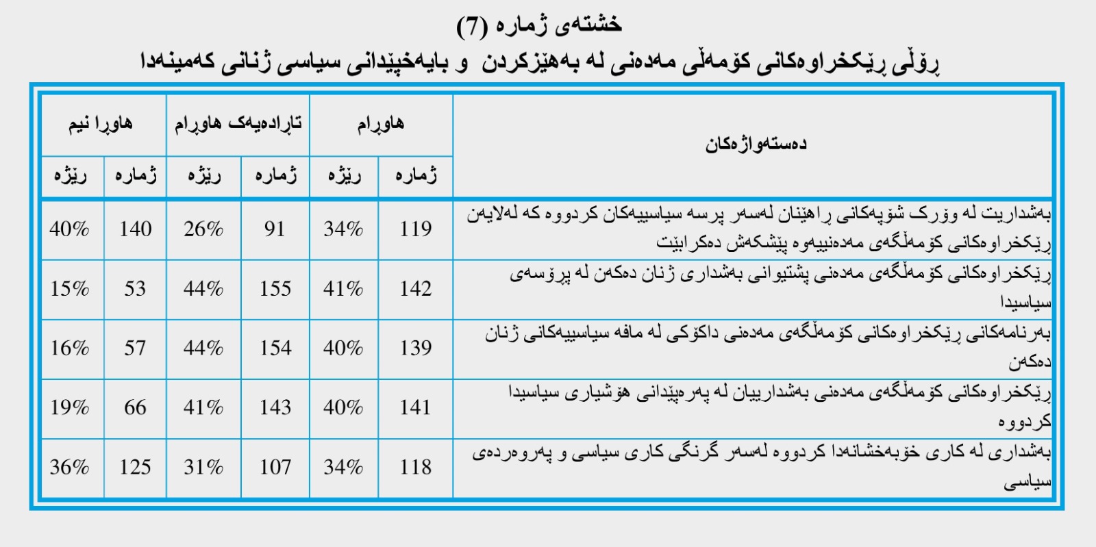 وەک لە خشتەی ژمارە (7)دا هاتووە؛ دەرئەنجامی وەڵامی بڕگەی یەکەم پەیوەست بە بەشداری ژنانی کەمینەکان لە وۆرک شۆپەکانی ڕاهێنان کە پەیوەندییان بە پرسە سیاسییەکانەوە هەیە، (140) وەڵام بە ڕێژەی (40%)، بەرزترین ڕێژەیە بۆ بژاردەی (هاوڕانیم)، لە کاتێکدا کەمترین وەڵام بۆ بژاردەی (هاوڕام) دەستنیشانکراوە، داتا ئامارییەکان ئاماژە بەوە دەکەن کە بەرنامەی ئەوتۆی ڕاهێنان و وۆرک شۆپەکانی پەیوەست بە کاروباری سیاسی کە ژنانی کەمینەکان دەکەنە ئامانج ئەنجام نادرێت، ئەمەش دەگەڕێتەوە بۆ ئەوەی کە زۆربەی ڕێکخراوەکانی کۆمەڵگەی مەدەنی لە ناوچە کەمینەکاندا لە دوای قۆناغی شەڕ لەگەڵ داعش چالاک بوون، بۆیە زۆربەی سەرنجەکانی لەسەر دابینکردنی چالاکیی فریاگوزاری بووە پەیوەست بە مافەکانی مرۆڤ، بنیاتنانی ئاشتی و پرسەکانی پێکەوەژیانی ئاشتیانە، بەڵام کەمتەرخەمی کراوە لە پێشکەشکردنی بەرنامە سیاسییەکان کە هۆشیاری سیاسی بۆ ژنانی کەمینەکان.