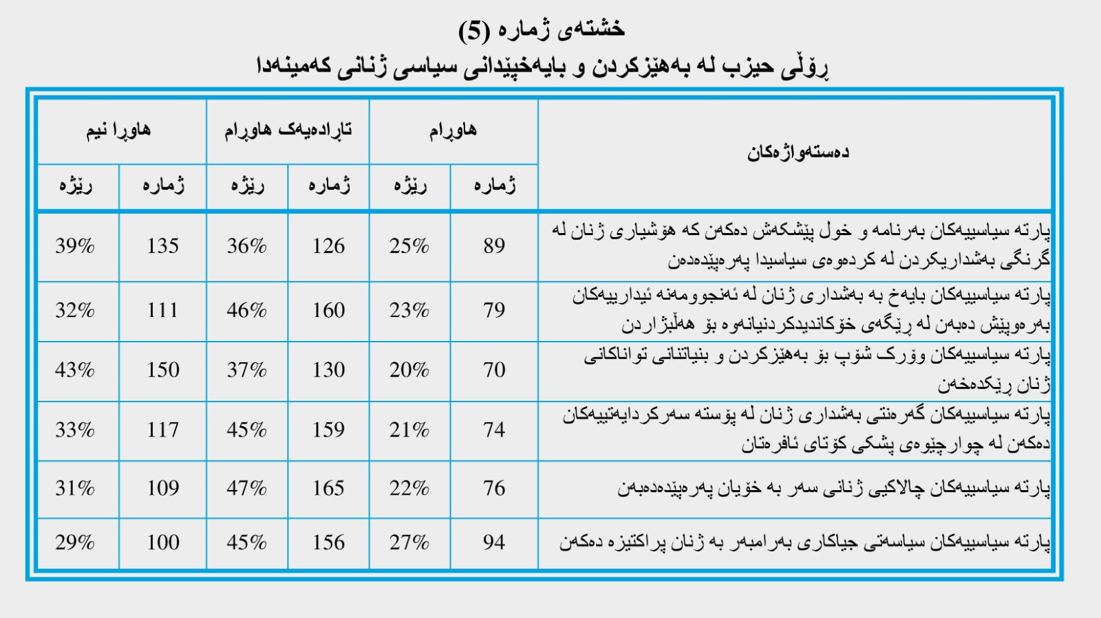 وەک لە خشتەی ژمارە (5) دا رونکراوەتەوە؛ بڕگەی یەکەمی ئەم تەوەرە پەیوەندی بەوەوە هەیە کە ئایا لایەنە سیاسییەکان بەرنامە و خول پێشکەش دەکەن کە هۆشیاری ژنان لە گرنگی بەشداریکردن لە کردەوەی سیاسیدا زیاد بکات، (135) بەشداربوو بە ڕێژەی (39%) کە بەرزترین رێژەیە (هاوڕانیم)یان دەستنیشان کەدووە، ئەم داتایە ئاماژەیە بەوەی کە ژنانی کەمینەکان بەرنامەیەکی ئەوتۆ لە لایەنە سیاسییەکانەوە وەرناگرن بۆ بەهێزکردنیان لە ڕووی سیاسییەوە و بەشداریکردنیان لە ژیانی سیاسیدا، و ئەمەش ئاماژەیە بۆ پشتگوێخستنی ئەم پۆلە لە لایەنە سیاسییەکانەوە.