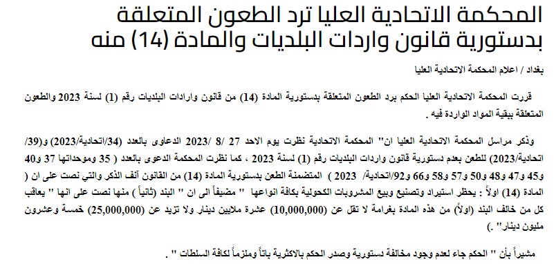 دادگای باڵای فیدراڵی عێراق بڕیاری خۆی لەبارەی ئەو سكاڵایانە یەكلاكردەوە كە لەبارەی یاسای (داهاتی شارەوانییەكان) ژمارە (1)ی ساڵی 2023 تۆماركرابوون.