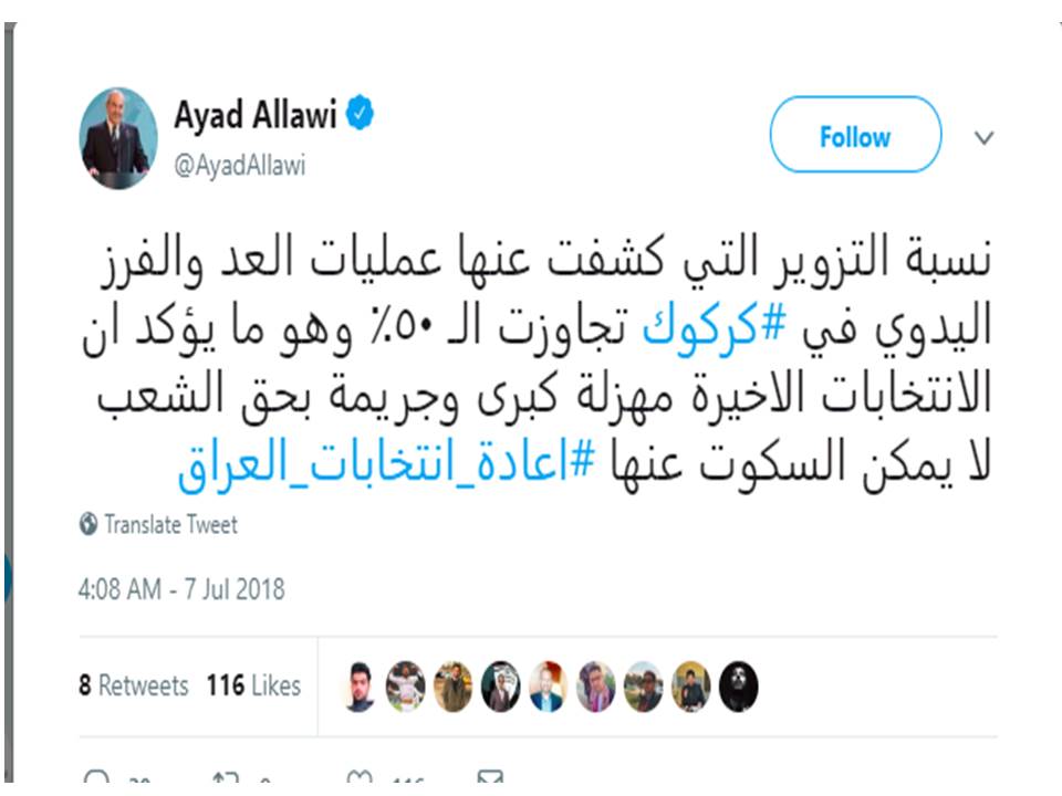 عەلاوی لە تویتێكدا لە تۆڕی كۆمەڵایەتی فەیسبوك دەڵێت :" رێژەی ئەو ساختكارییەی پرۆسەی جیاكردنەوە و ئەژماركردنەوەی دەستی دەنگەكان لە كەركوك ئاشكراشیكردووە لە 50% تێپەڕیكردووە و ئەوەش ئەوە دەسەلمێنێت كە ئەم هەڵبژاردنەی دوایی گاڵتەجاڕییەكی گەورە و تاوانێك بوو دژ بە مافی گەل و ناكرێت لێی بێدەنگ بین".