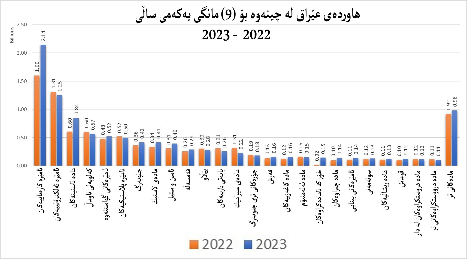 • ساڵی رابردوو لە هەمان وادەدا تێكڕای هەناردەی چین بۆ عێراق بڕی (9 ملیارو 600 ملیۆن) دۆلار بووە.