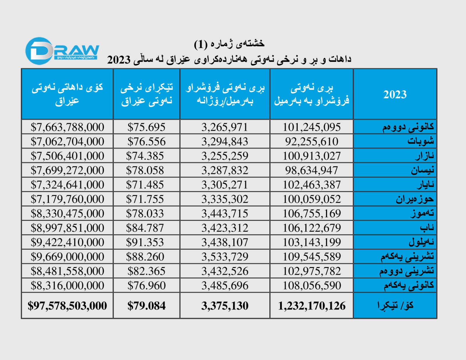 ? کۆی داهاتی فرۆشراوی نەوتی عێراق لە ساڵی (2023)دا (97 ملیار و 578 ملیۆن و 503 هەزار) دۆلار بووە. بەڵام لە ساڵی (2022)دا گەیشتبووە (115 ملیار و 568 ملیۆن و 801 هەزار) دۆلار. واتە لە ساڵی (2023) بەراورد بە ساڵێ پێش خۆی نزیکەی (18 ملیار) دۆلار و بە ڕێژەی (16%) داهاتی نەوت کەمی کردووە.